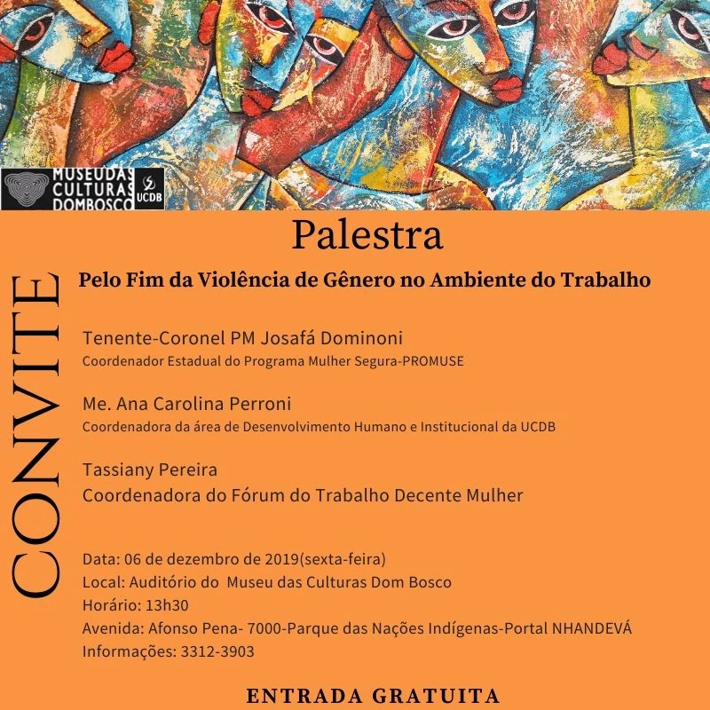 O Museu das Culturas Dom Bosco UCDB irá promover na próxima sexta-feira (6) palestra com o tema “Pelo Fim da Violência de Gênero no Ambiente de Trabalho”. Com entrada gratuita, o evento será realizado no auditório do Museu das Culturas Dom Bosco às 13h30.