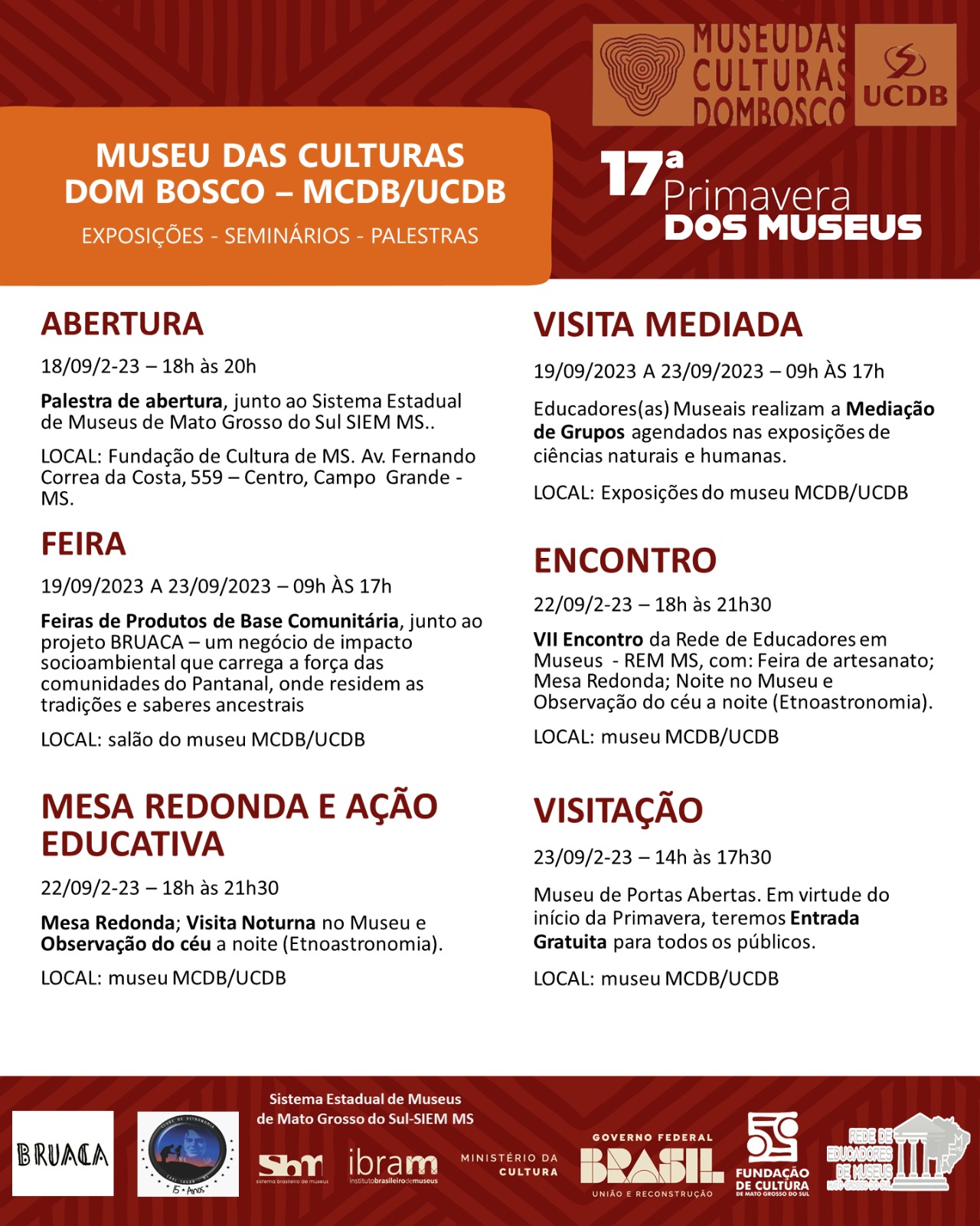 O Museu das Culturas Dom Bosco, da Universidade Católica Dom Bosco (MCDB/UCDB), vai sediar de 18 a 23 de setembro a 17ª edição da Primavera dos Museus em Mato Grosso do Sul, junto ao Sistema Estadual de Museus (Siem), exceto a abertura que será no MIS MS, localizado na avenida Fernando Corrêa da Costa, 559, em Campo Grande.