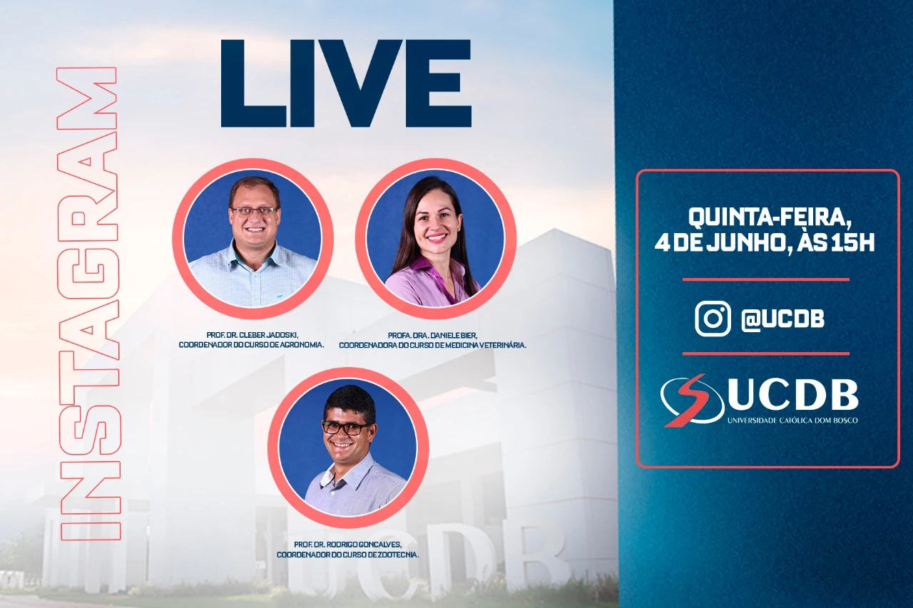 A área de Ciências Agrárias é o tema da live que será promovida pela Universidade Católica Dom Bosco (UCDB) no Instagram (@ucdb), nesta quinta-feira (4), às 15h. Por meio de um bate-papo descontraído, os interessados podem saber mais sobre os cursos de Zootecnia, Medicina Veterinária e Agronomia.