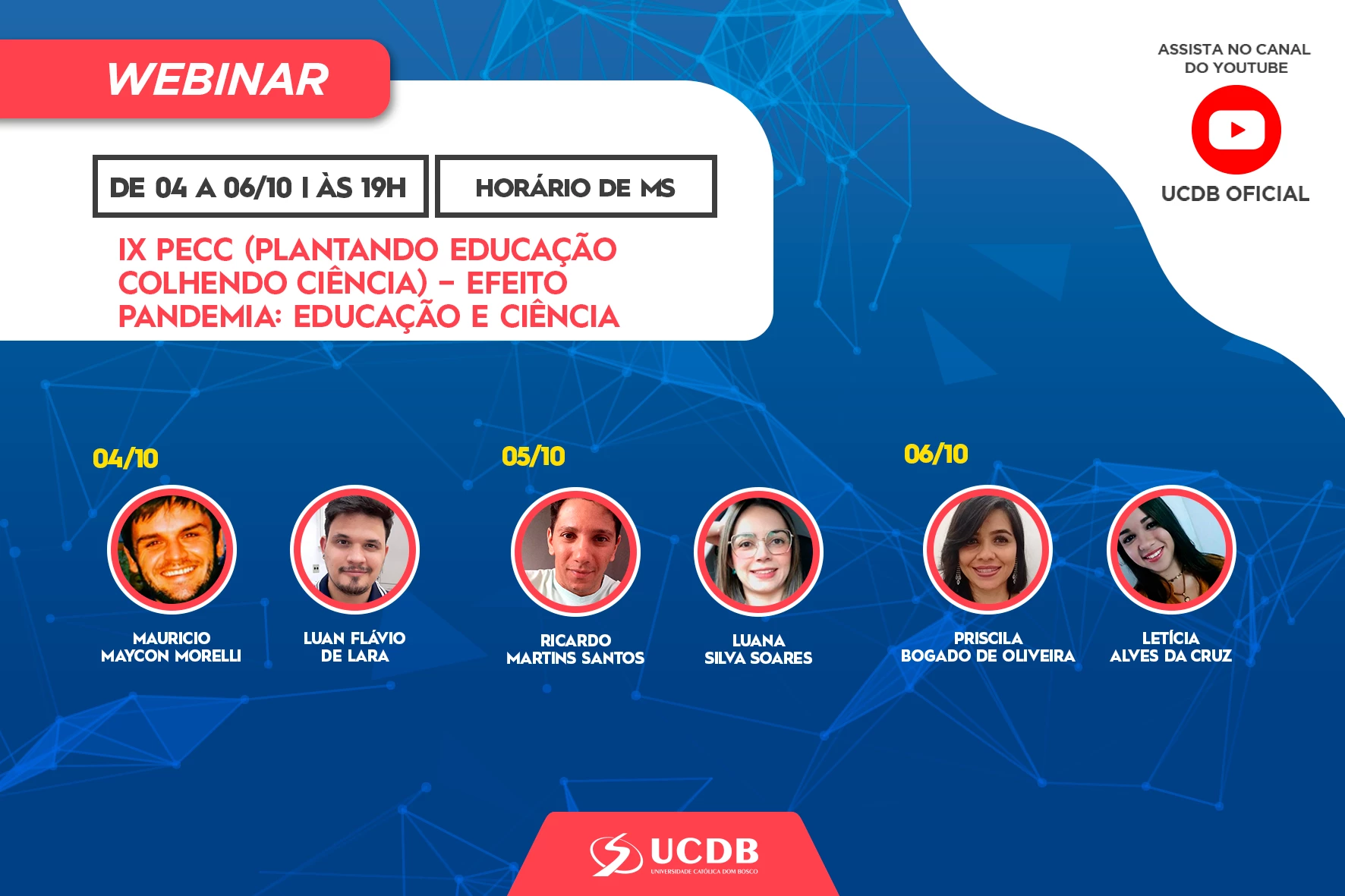 Começa na próxima segunda-feira (4), às 19h, de forma on-line, e vai até o dia 6 de outubro, a nona edição da webinar ‘Plantando Educação Colhendo Ciência’, com o tema ‘Efeito Pandemia: Educação e Ciência’, promovido pelo curso de Ciências Biológicas da Universidade Católica Dom Bosco (UCDB). O evento, que terá transmissão pelo YouTube oficial da Católica, é destinado para acadêmicos de cursos da área da saúde.