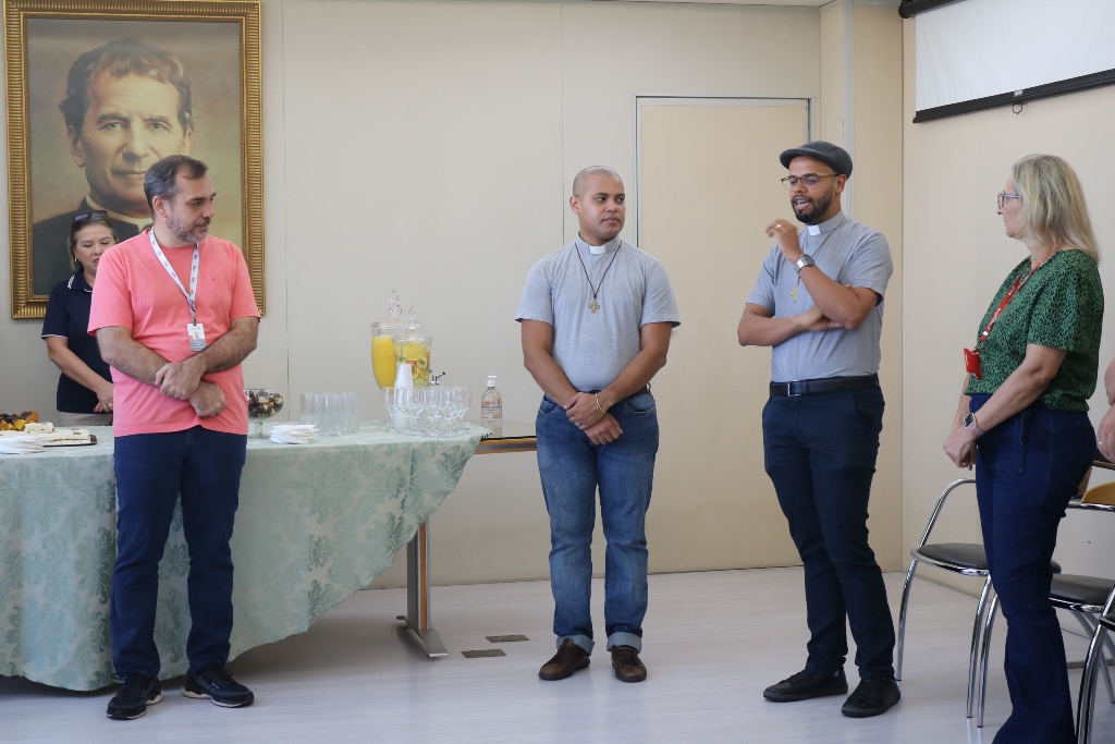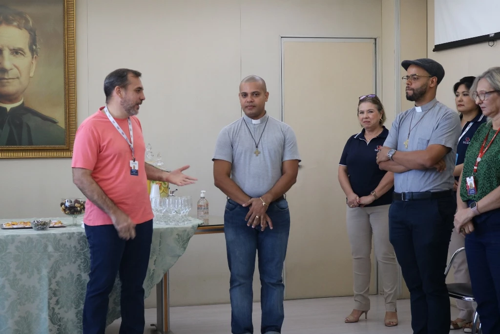 O padre salesiano Rafael Gustavo Santos Souza Lopes é o novo pró-reitor de Pastoral e Assuntos Comunitários da Universidade Católica Dom Bosco (UCDB) e será empossado amanhã (30), durante reunião do Conselho de Reitoria. Hoje (29), o religioso foi apresentado aos líderes administrativos e recebeu as boas-vindas do Reitor em exercício, Taner Douglas Bitencourt e dos pró-reitores Rubia Renata Marques e Cristiano Marcelo Espínola Carvalho. O encontro também marcou a despedida do Pe. Idenilson Lemes da Conceição, que assumiu a missão de comandar a Paróquia Salesiana São Gonçalo, em Cuiabá (MT).