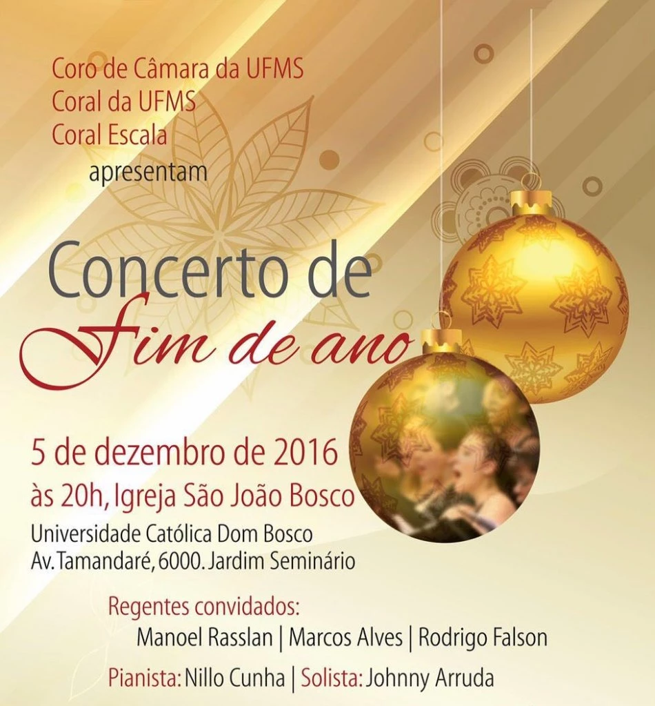 Hoje (5), às 20h, na Igreja São João Bosco da Universidade Católica Dom Bosco (UCDB) vai ser realizado o oratório ‘O Messias’ — concerto de Fim de Ano, apresentado pelos grupos de arte da Universidade Federal do Mato Grosso do Sul (UFMS), Coro de Câmara da UFMS, Coral da UFMS e Coral Escala. Para a apresentação foram convidados os regentes Manoel Rasslan, Marcos Alves e Rodrigo Falson. O pianista será Nillo Cunha e o solista Johnny Arruda.