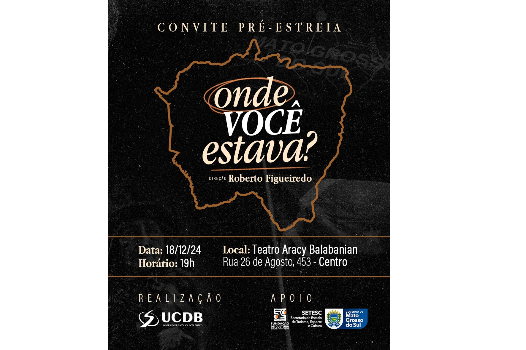 O documentário “Onde você estava?” será lançado nesta quarta-feira (18), às 19h, no teatro Aracy Balabanian, em Campo Grande. O filme foi dirigido pelo professor Roberto Figueiredo, que faleceu na última sexta-feira (13). A data da estreia já estava planejada e, por decisão conjunta da Universidade Católica Dom Bosco (UCDB), Secretaria de Estado de Turismo, Esporte e Cultura (Setesc), Fundação de Cultura de Mato Grosso do Sul e da família do docente, a programação foi mantida como uma forma de homenageá-lo.