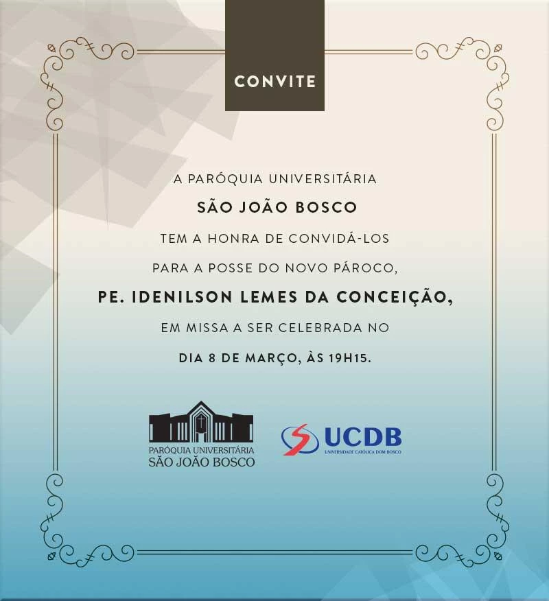 O Pró-Reitor de Pastoral e Assuntos Comunitários, Pe. Idenilson Lemes da Conceição, será empossado no próximo domingo (8), às 19h15, como o novo pároco da Paróquia Universitária São João Bosco da Universidade Católica Dom Bosco (UCDB). A missa será presidida pelo arcebispo metropolitano de Campo Grande, Dom Dimas Lara Barbosa, contará ainda com a presença de toda a família salesiana e fiéis da região.