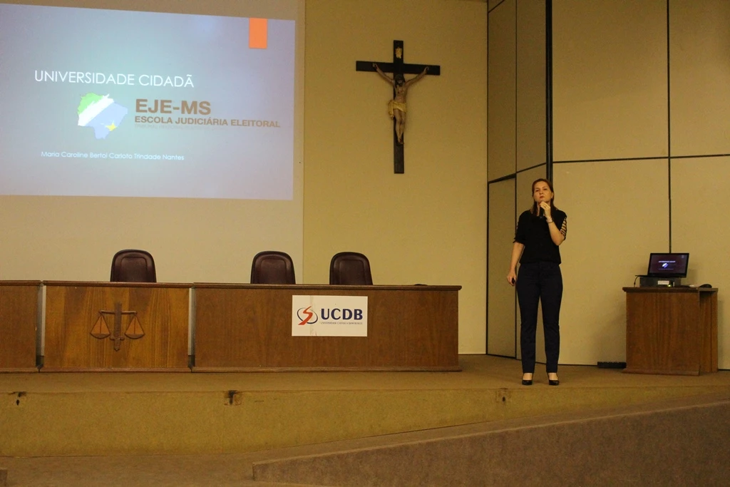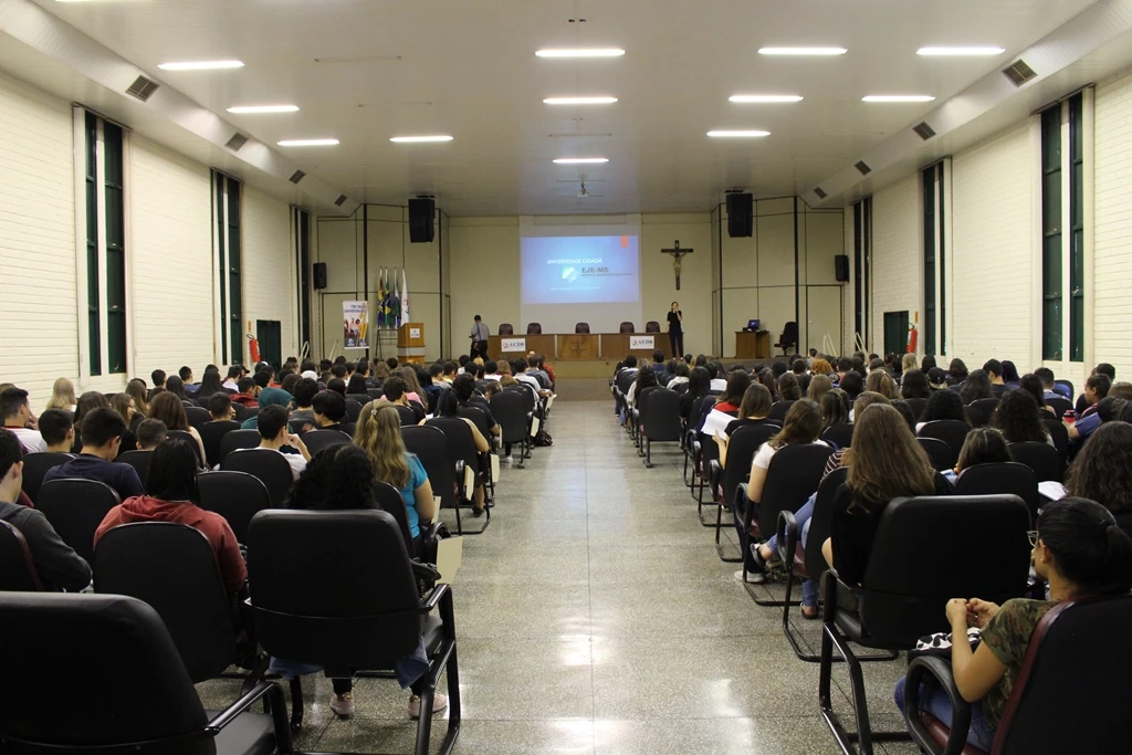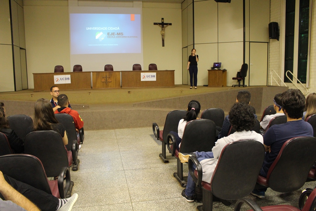 Acadêmicos dos cursos matutinos da Universidade Católica Dom Bosco (UCDB) participaram nesta quarta-feira (24) da palestra Cidadania e voto, que integra o Projeto Universidade Cidadã, uma iniciativa da Escola Judiciária Eleitoral do Tribunal Regional Eleitoral de Mato Grosso do Sul.