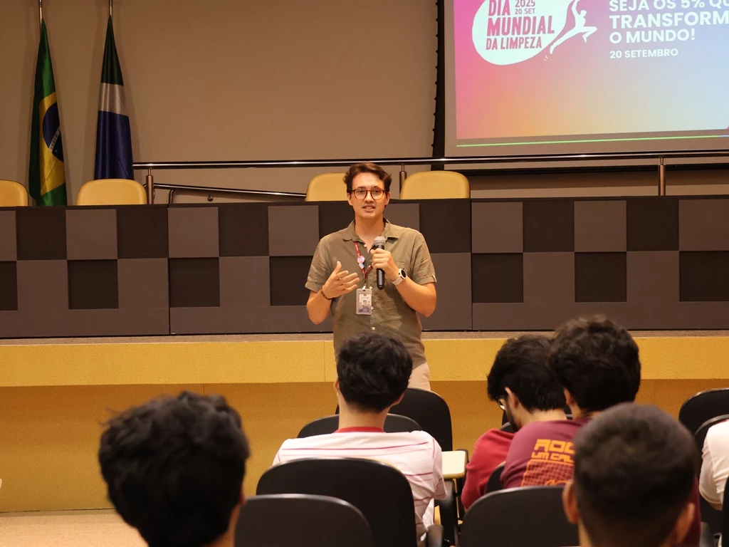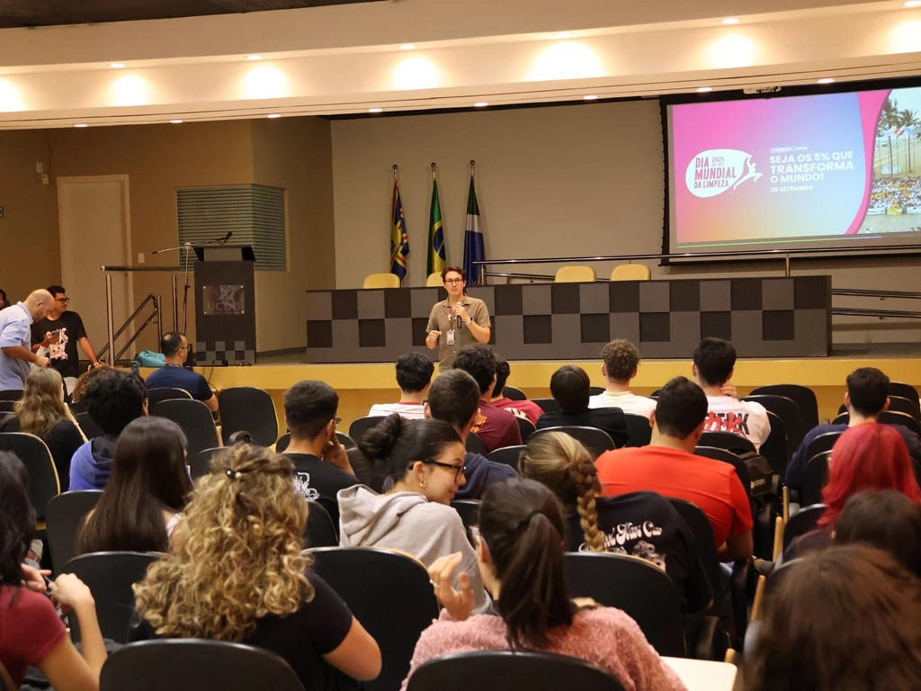 Para motivar ainda mais participantes, o professor, Gabriel Ferraciolli, ministrou hoje (18/09), no auditório do bloco M da Católica, a palestra ‘Seja os 5% que transformam o mundo: Dia Mundial da limpeza 2025’ para acadêmicos de Publicidade e Propaganda, Design e Educação Física. “Com esse movimento esperamos um resultado impactante para o meio ambiente. A ideia do evento é justamente falar que esses, 5% vão influenciar e mobilizar as demais pessoas”, destacou o docente e líder da ação em Campo Grande.