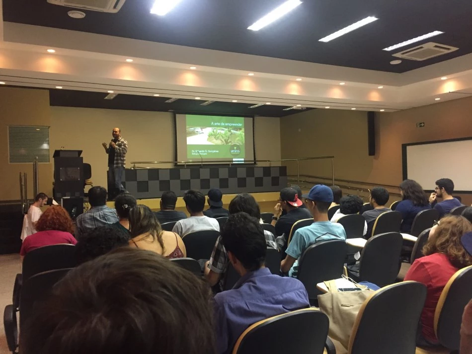 Além dos ex-alunos da Católica, o professor Dr. Eduardo Gonçalves também foi convidado para falar com os alunos. Biólogo e paisagista, atua na Agência de Inovação e Empreendedorismo da Universidade Católica Dom Bosco – S-Inova e, por isso, abordou o tema A arte de empreender. “Apesar do que as pessoas pensam, a crise é o melhor momento para empreender porque até nas áreas que já existem, o que é oferecido já está nivelado, então é um boa hora pra começar e, além disso, as pessoas estão esperando novas ideias”, expôs Eduardo.