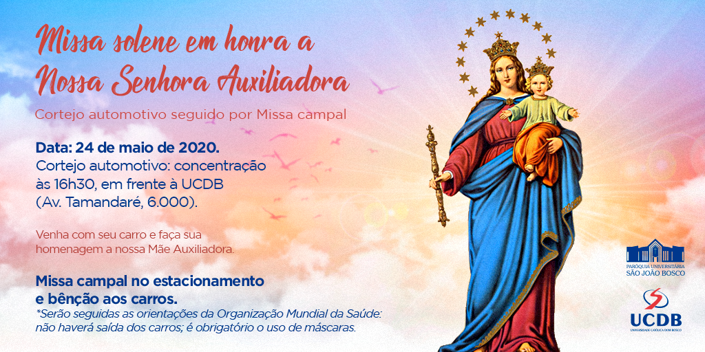 A Paróquia Universitária São João Bosco da Universidade Católica Dom Bosco (UCDB) realiza no próximo domingo (24), dia de Nossa Senhora Auxiliadora, cortejo automotivo e missa, no estilo drive-thru, em honra a padroeira da família salesiana. A concentração para do cortejo será às 16h30, em frente à entrada principal da Universidade, na avenida Tamandaré, seguida de Missa, no Estacionamento da Católica.