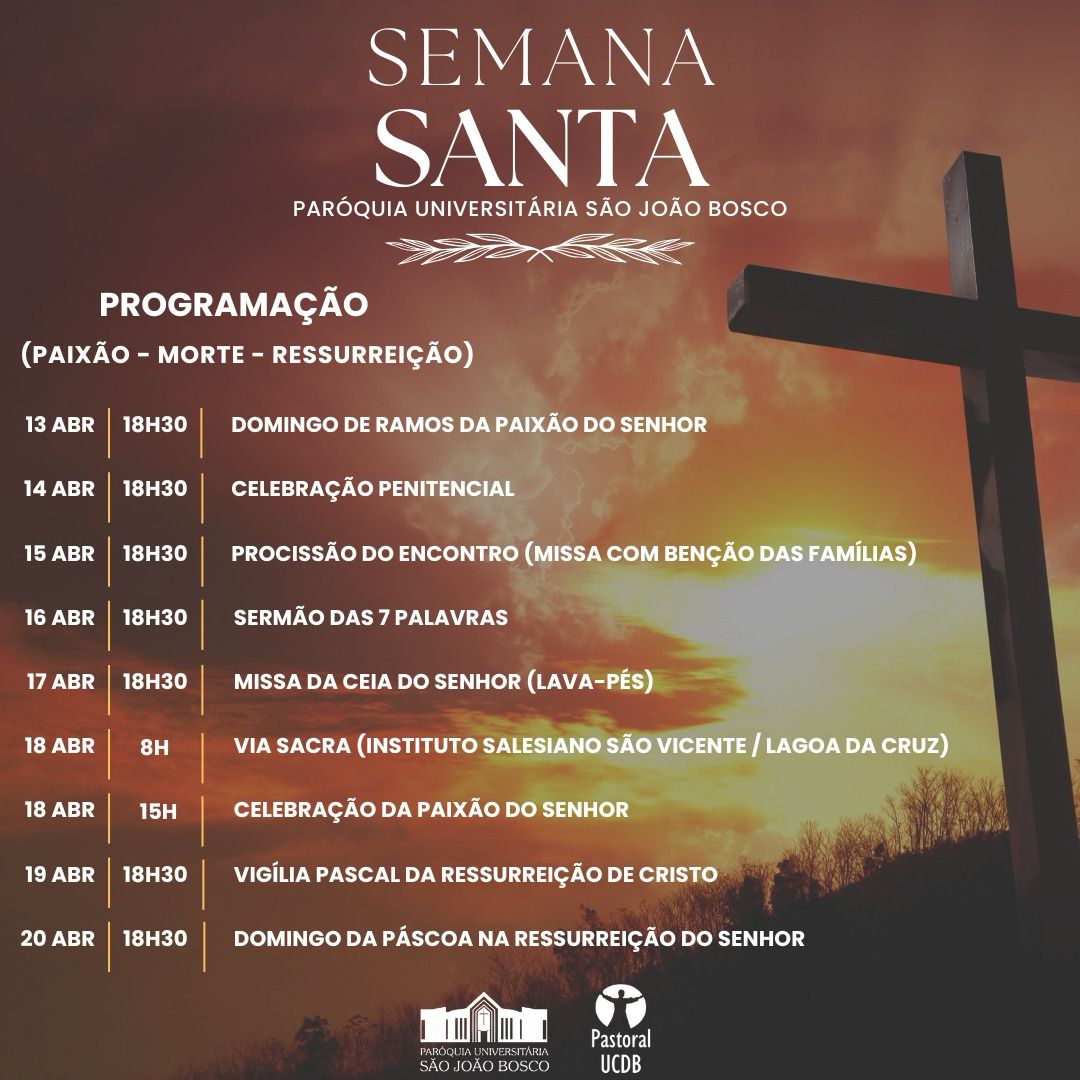 A Paróquia Universitária São João Bosco da Universidade Católica Dom Bosco (UCDB) realiza programação especial durante a Semana Santa, que começa no dia 13 de abril com o Domingo de Ramos, com a santa Missa às 18h30. Nesta data a entrada na Católica é gratuita, e as celebrações abertas para toda a comunidade.