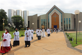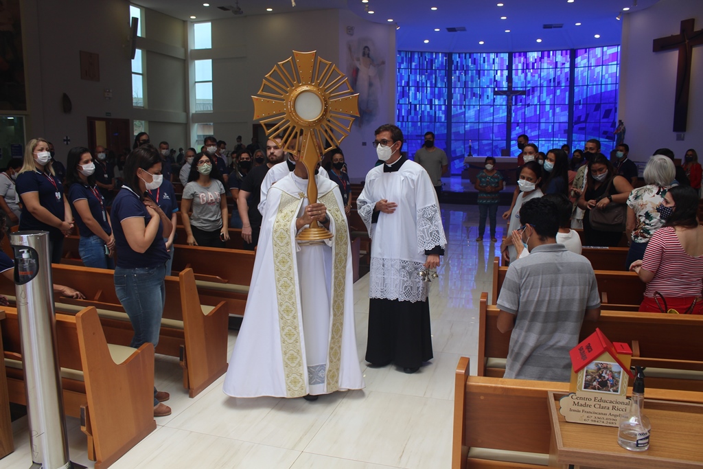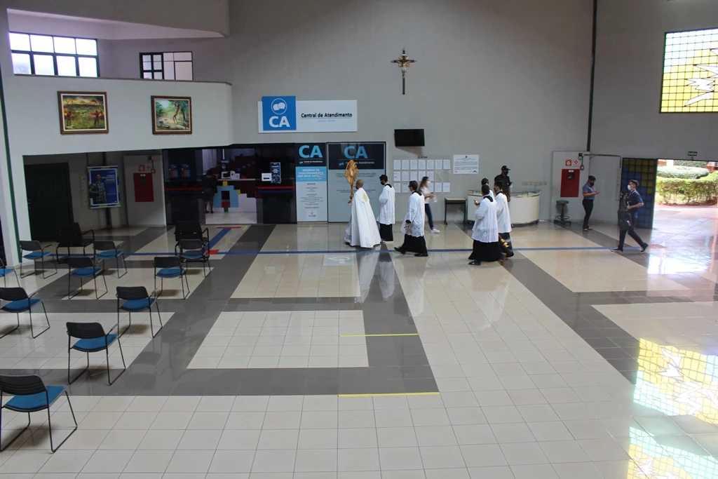 Logo após a celebração, o Santíssimo Sacramento foi levado a cada setor do bloco Administrativo, abençoando os funcionários e também o ambiente de trabalho. Durante o restante do dia o Santíssimo ficará exposto no bloco B para adoração dos fiéis.