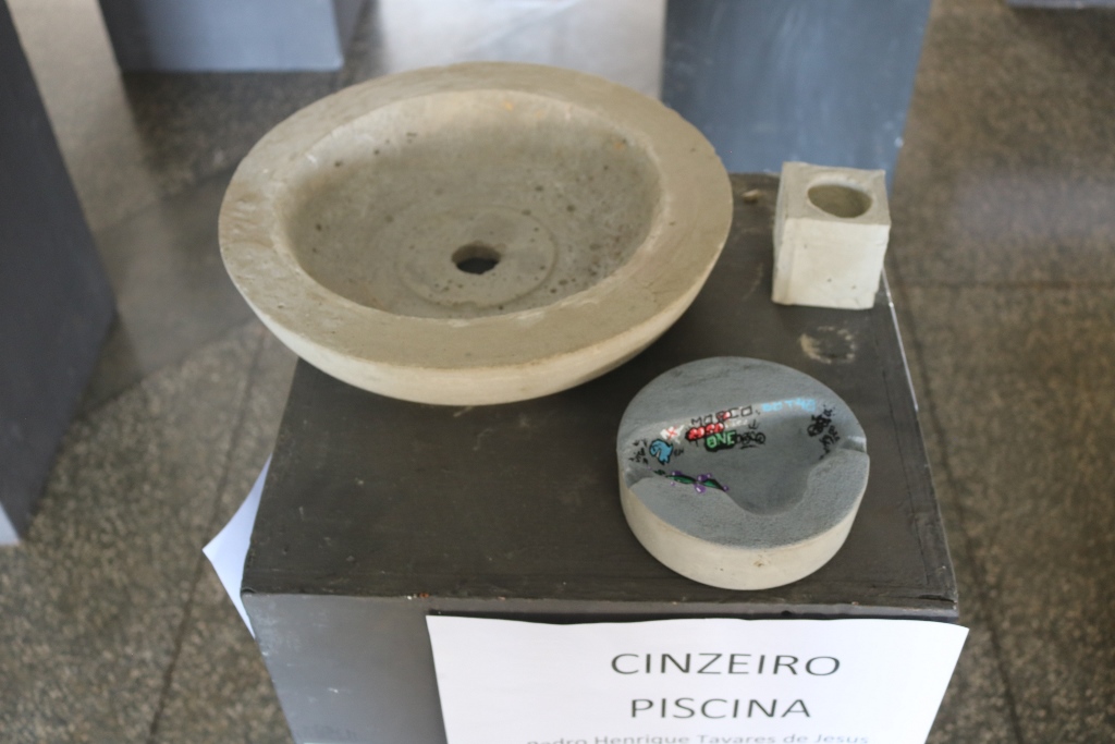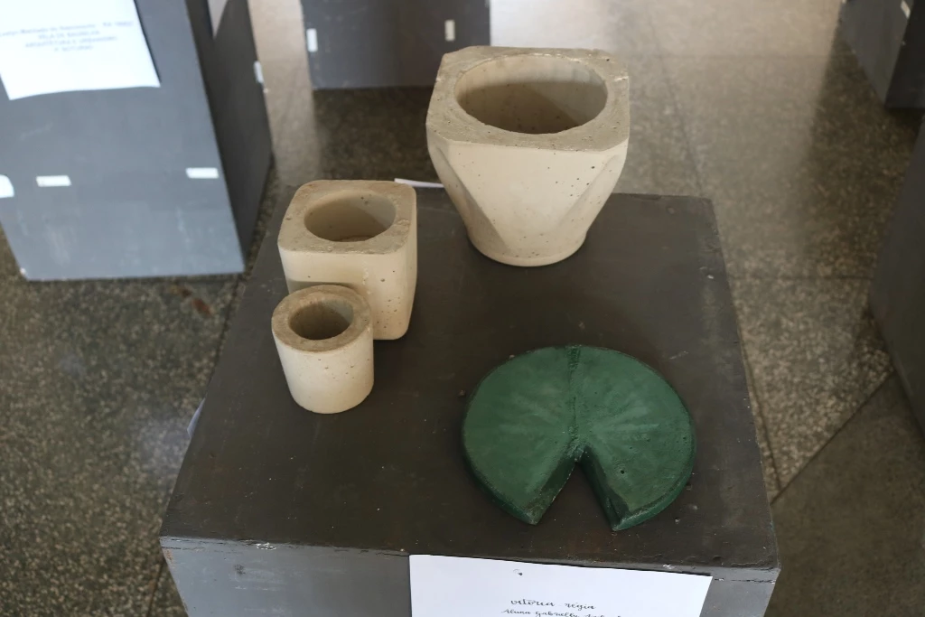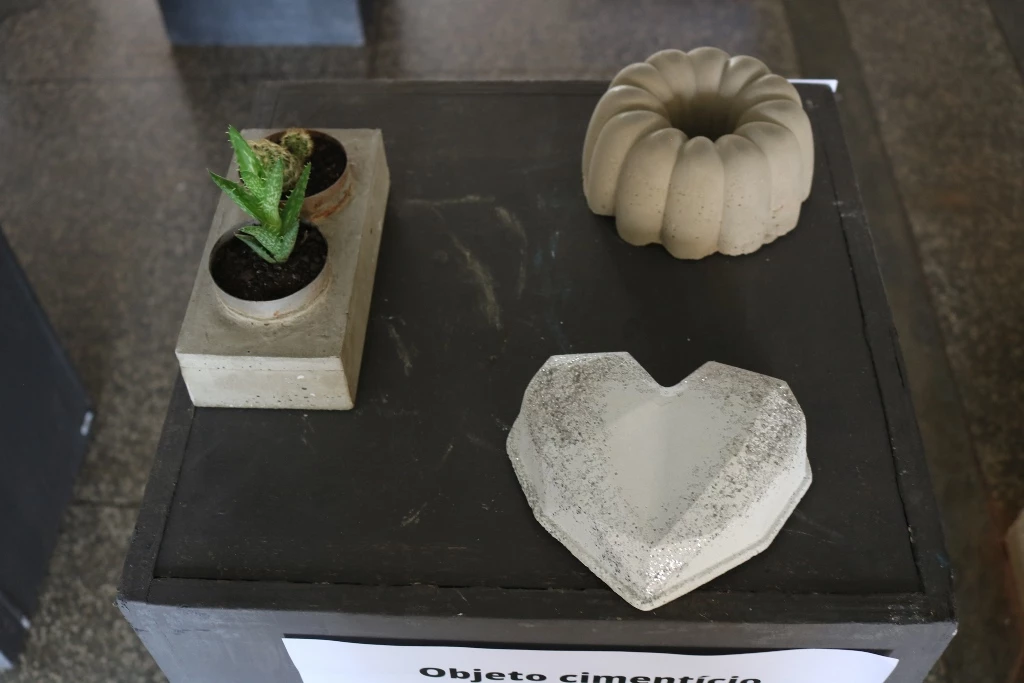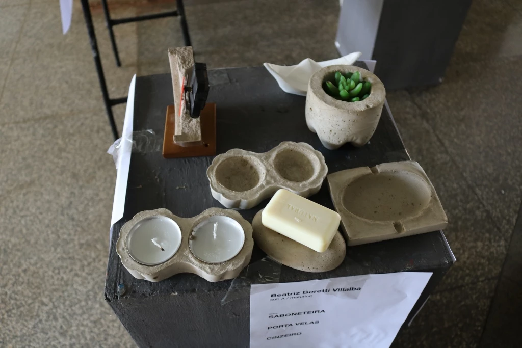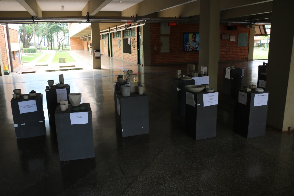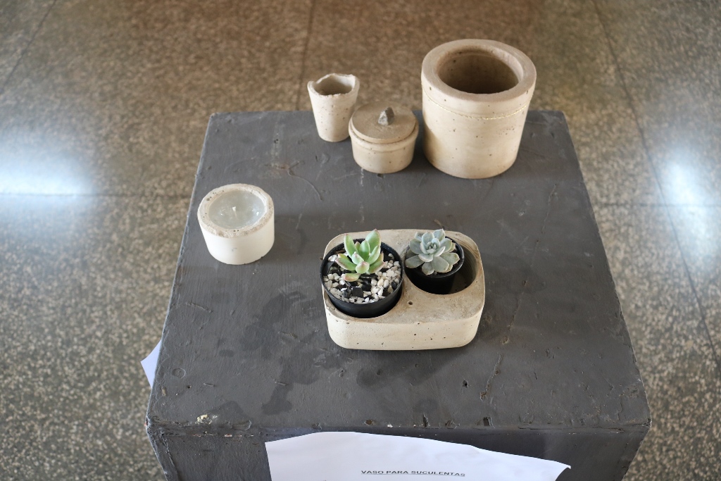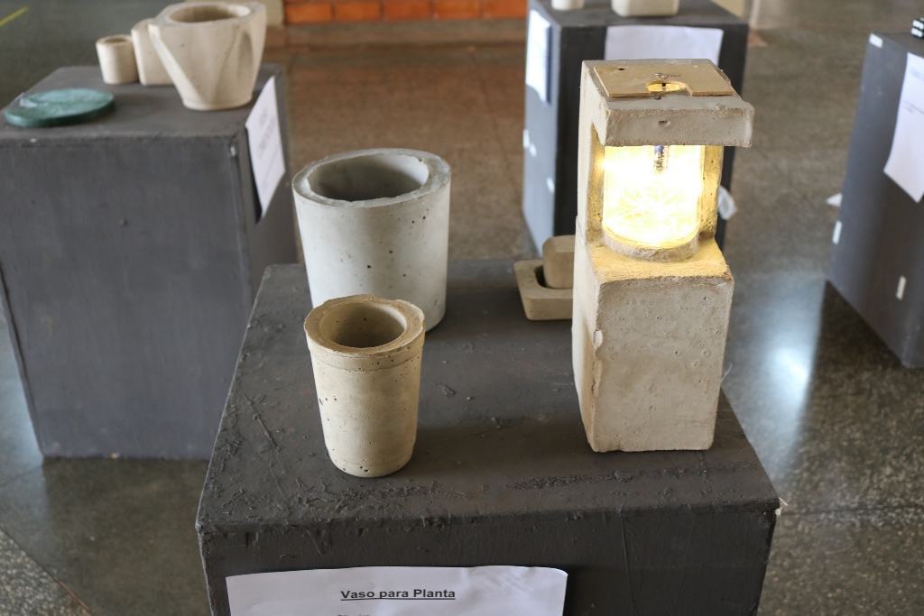 São 60 peças expostas, como vasos, cinzeiros, fruteiras, peso de porta e luminárias feitas com cimento.Além das misturas de argamassas de assentamento e reboco realizadas em sala de aula (laboratório de materiais), assim como os concretos com os traços mais usuais, essas peças foram feitas no laboratório. Alguns precisaram concluir em casa. “Eles ficaram livres para criar e também para decidir qual melhor traço e também o método de execução”, completou o docente.