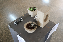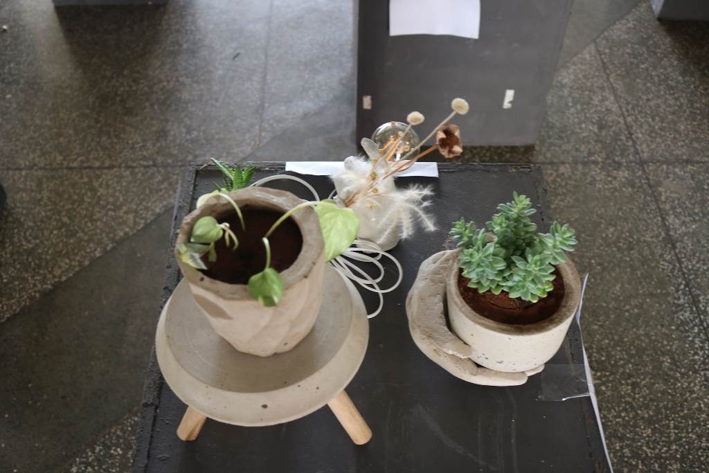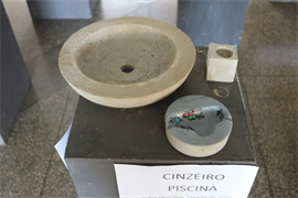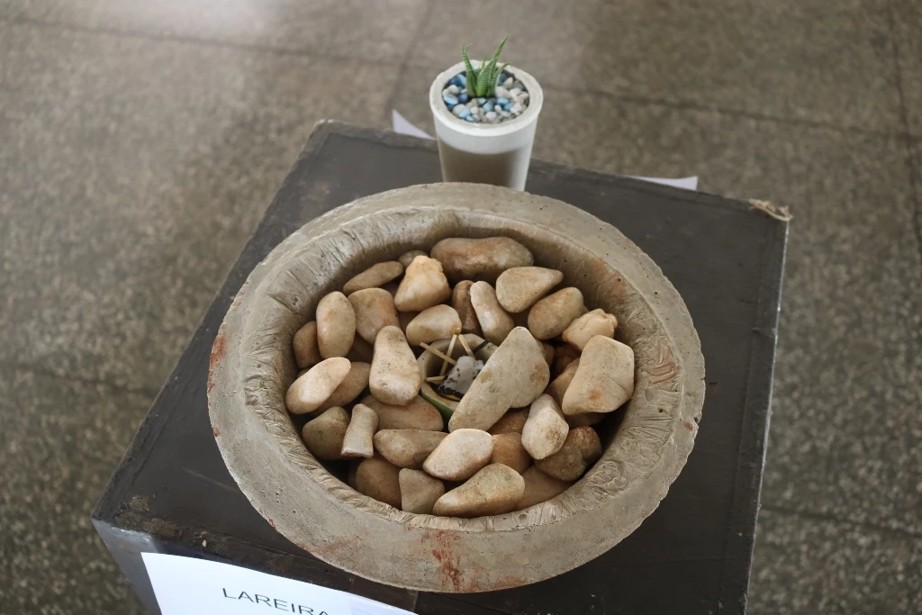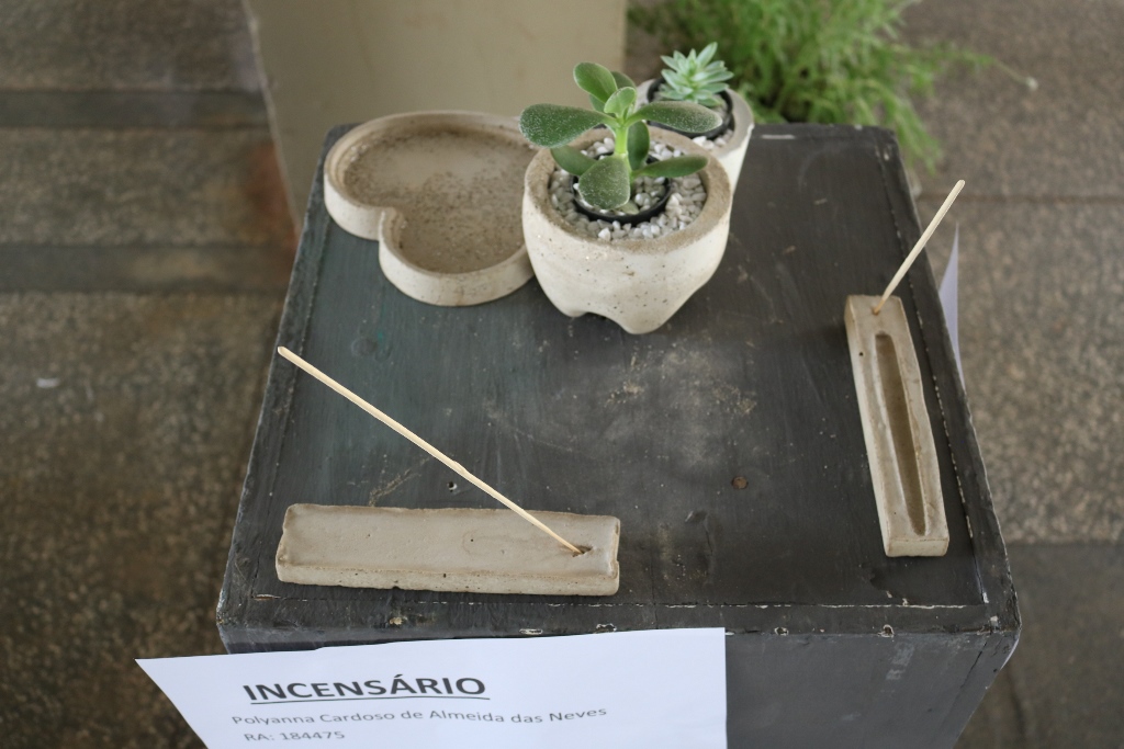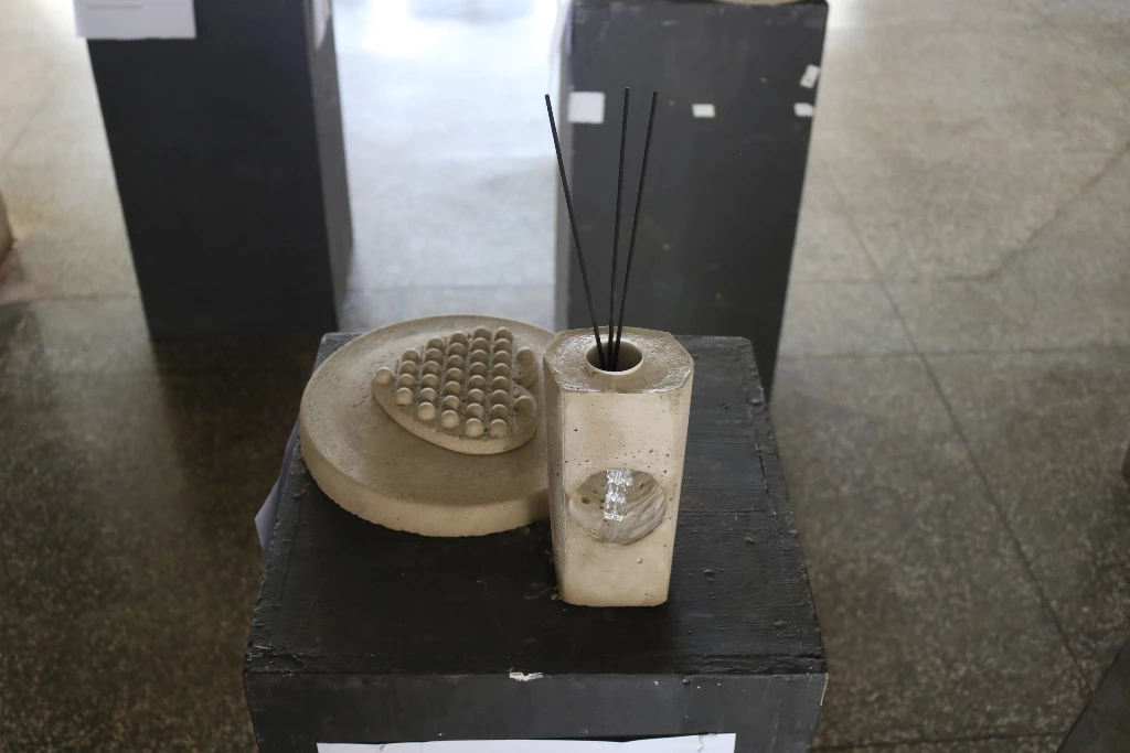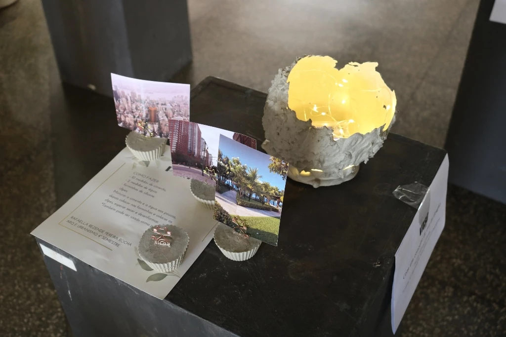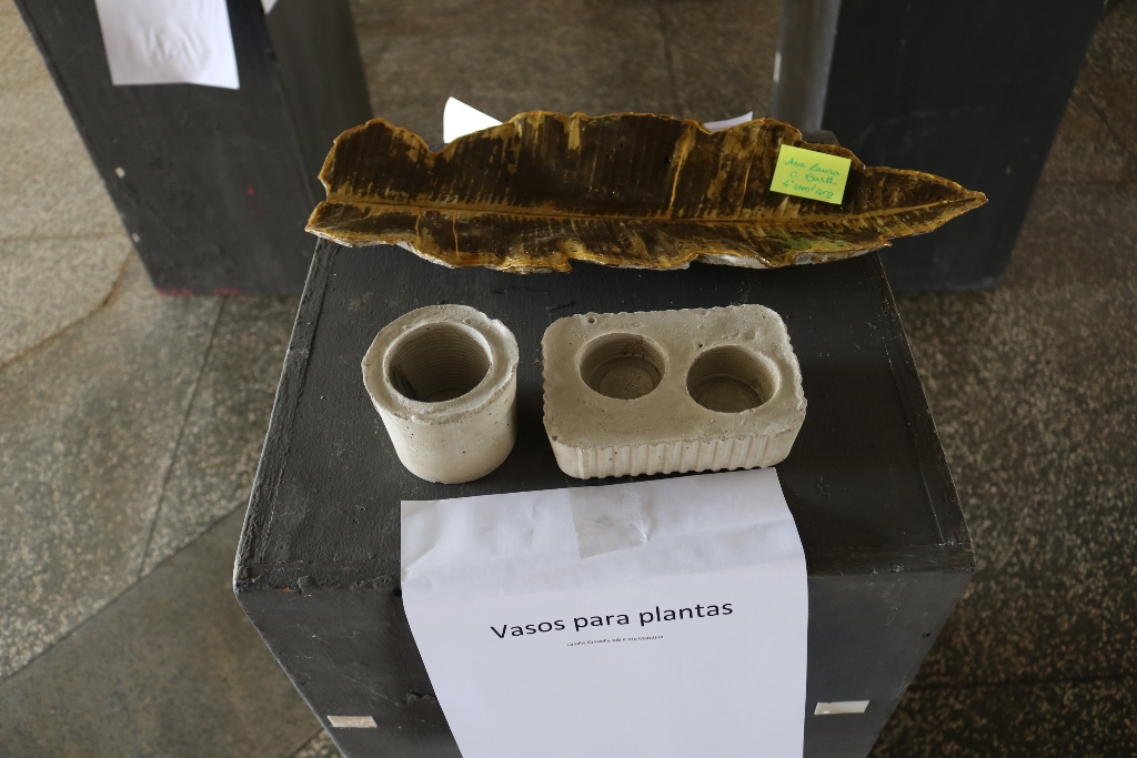 São 60 peças expostas, como vasos, cinzeiros, fruteiras, peso de porta e luminárias feitas com cimento.Além das misturas de argamassas de assentamento e reboco realizadas em sala de aula (laboratório de materiais), assim como os concretos com os traços mais usuais, essas peças foram feitas no laboratório. Alguns precisaram concluir em casa. “Eles ficaram livres para criar e também para decidir qual melhor traço e também o método de execução”, completou o docente.