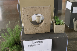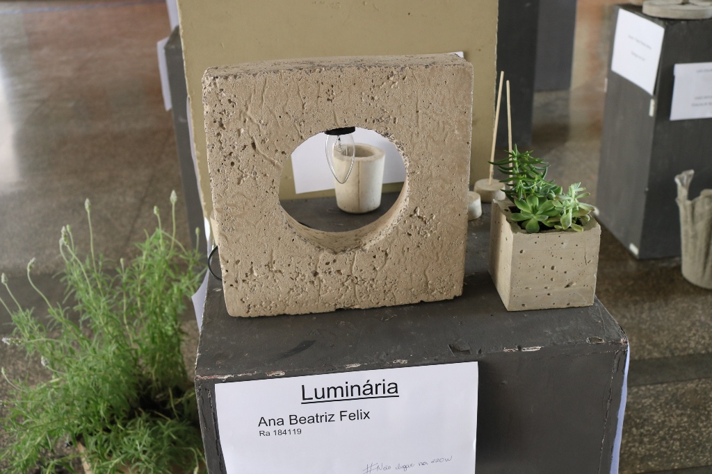 A acadêmica Ana Beatriz de Almeida Felix fez uma luminária de concreto, utilizando areia, cimento e brita para formar a massa. “Eu queria um objeto diferente do convencional e eu nunca imaginei poder criar com um material comumente utilizado na construção civil para fazer objetos de decoração. E ter que pensar em todo o processo do molde, passagem do fio condutor de energia, secagem e retirada do molde foi extremamente gratificante, um pouco estressante também, mas ver a minha ideia pronta valeu a pena. Foi realmente uma experiência diferente e única”, destacou a estudante.