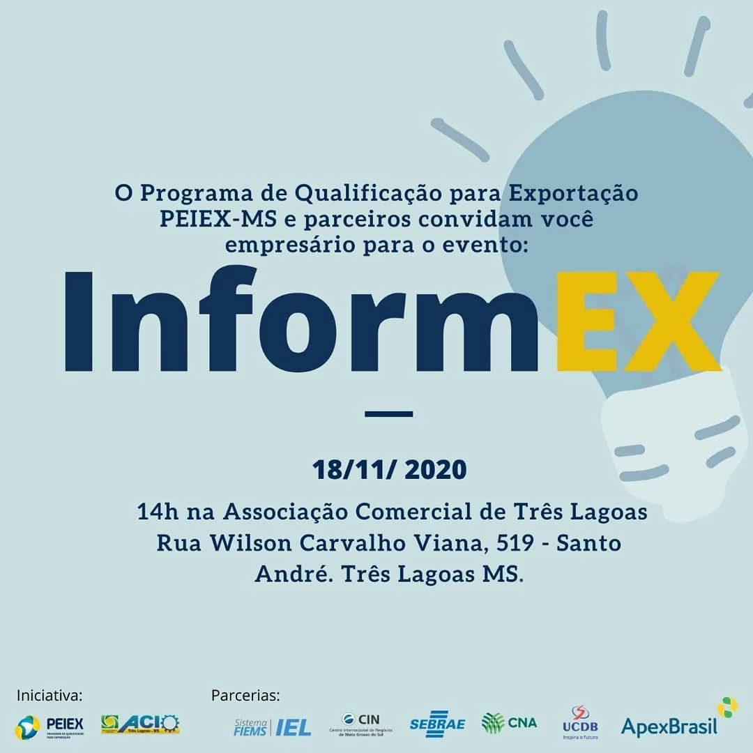 O Programa de Qualificação para Exportação (Peiex) da Universidade Católica Dom Bosco (UCDB), por meio da Agência de Inovação e Empreendedorismo (S-Inova), participa no dia 18, às 14 horas, da ação InformEX, juntamente com o Serviço Brasileiro de Apoio às Micro e Pequenas Empresas de Mato Grosso do Sul (Sebrae), Associação Comercial de Três Lagoas, Confederação da Agricultura e Pecuária do Brasil (CNA) e Federação das Indústrias do Estado de Mato Grosso do Sul (Fiems) para levar informações sobre exportações a empresários. O evento será realizado na Associação Comercial de Três Lagoas, localizada à Rua Wilson Carvalho Vianna, 519, no bairro Santo André.