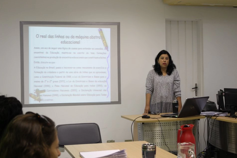 Cláudia expôs uma problematização na educação escolar ao mostrar que o processo de formação funciona muito mais como uma normalização e regulação de condutas, de maneira a padronizar o modo de viver e de ser dos alunos. Diante desse cenário, a doutoranda questionou se é isso o que a prática escolar almeja e concluiu que essa realidade deveria ser mudada.