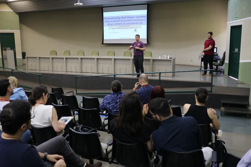 ‘Caracterização de sistemas de bicamadas lipídicas: de andaimes para ligação de proteínas a carreadores de fármacos em nanomedicina’ foi o tema abordado pelo palestrante italiano, mas que trabalha na Suécia. “Por que estudar membranas lipídicas? Eu trabalho com esse tipo de membrana sintética que derivamos de algo chamada fase nanodal, que é basicamente um empilhamento dessas flamellas separadas por uma área de água. E o melhor dessa fase é que elas podem ser expressas em água para produzir pesticidas. Talvez você as conheça como lipossomas, compostas por sua maioria em fosfolipídios, mas no geral são o mesmo”, destacou o pesquisador.