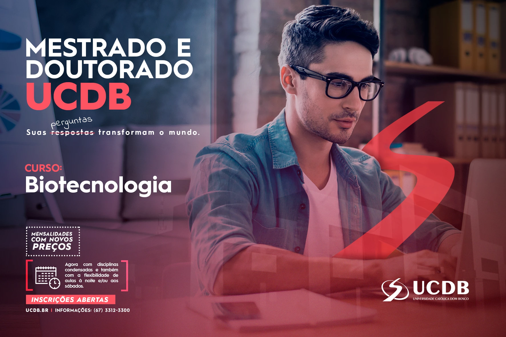 O Programa em Biotecnologia da UCDB está com inscrições abertas para 2021. Para o Mestrado, são 20 vagas disponíveis com inscrições até dia 16 de novembro; já o Doutorado é oferecido em fluxo contínuo. São três linhas de pesquisa: bioprospecção de princípios ativos, genes promotores e vetores de expressão; biotecnologia aplicada à agropecuária; e biotecnologia aplicada à saúde humana e animal.