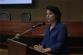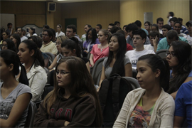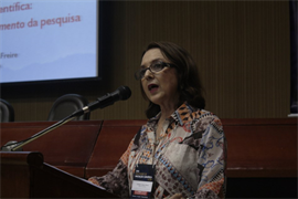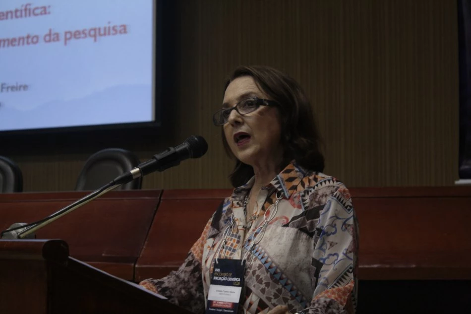 A palestrante da noite foi a Dra. Maximina Freire, da Pontifícia Universidade Católica de São Paulo (PUCSP), que abordou o tema “Iniciação Científica: descobrindo o encantamento da pesquisa”. “O ponto de partida de uma pesquisa é ter uma indagação. O processo de desenvolvimento não pode ter pressão, não pode ser enlouquecedor, nem fácil, nem algo que acabe com nossa vida. A pesquisa é um trabalho acadêmico que requer tempo e dedicação, exige comprometimento, requer leitura de várias fontes, demanda reflexões e associações”, enumerou.