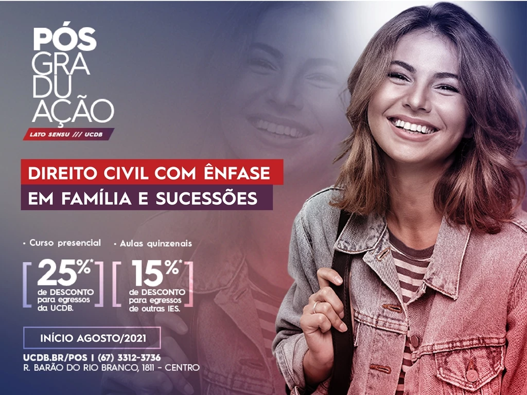Matrículas abertas para o curso de pós-graduação lato sensu ‘Direito Civil com ênfase em família e sucessões’ da Universidade Católica Dom Bosco (UCDB). As aulas serão realizadas quinzenalmente de forma presencial no Campus 2, localizado à Rua Barão do Rio Branco, 1811, no Centro de Campo Grande. As matrículas podem ser feitas acessando ucdb.br/pos.
