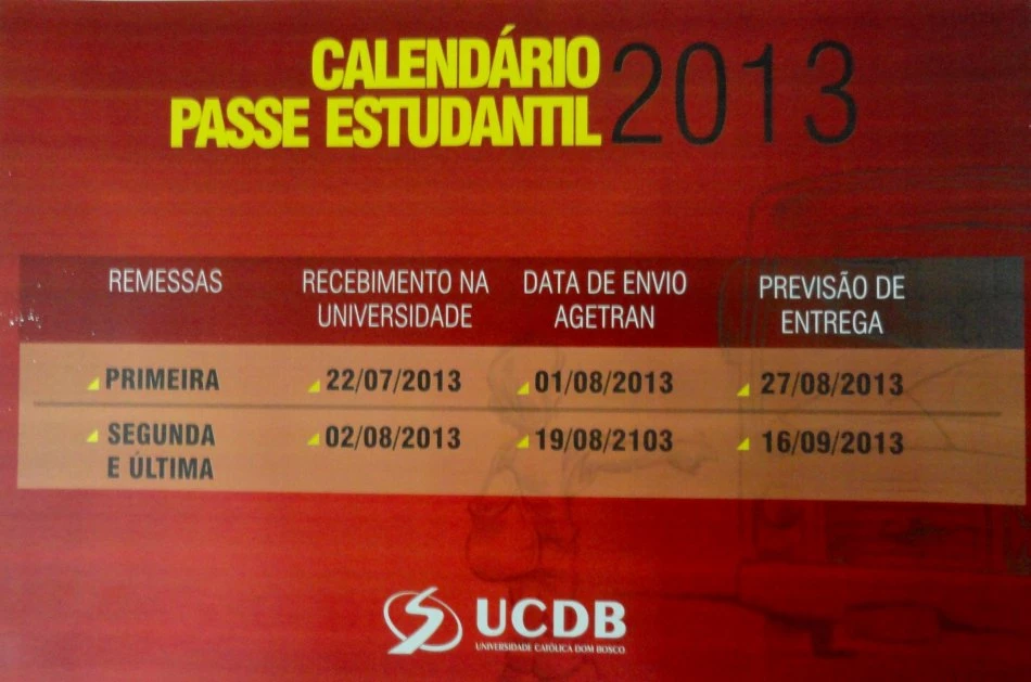 Acadêmicos da Universidade Católica Dom Bosco (UCDB) que ainda não contam com o benefício do Passe do Estudante podem solicitar até hoje (30) o beneficio que está em sua primeira remessa e a previsão de entrega é para o dia 27 de agosto. Já aos que perderam a primeira remessa ainda podem aproveitar a segunda e última remessa até o dia 19 de agosto, com a entrega prevista a partir do dia 16 de setembro.
