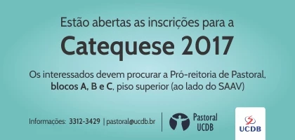 A Pró-Reitoria de Pastoral está com inscrições abertas para acadêmicos interessados em participar da catequese 2017. As inscrições podem ser feitas nas salas de Pastoral em cada bloco.