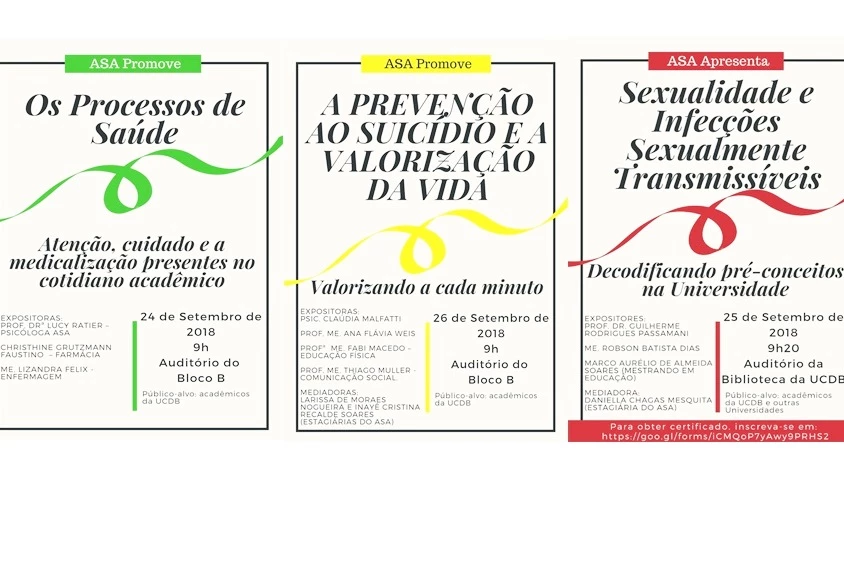 Na data, o assunto será abordado pela psicóloga do ASA, Dra. Lucy Ratier, pela professora do curso de Farmácia da UCDB Dra. Christine Grutzmann Faustino e pela docente de Enfermagem da Católica Me. Lizandra Alvares Félix Barros. Com outras duas mesas-redondas, o evento segue até quarta-feira (26) e tem a proposta de despertar nos acadêmicos os cuidados consigo próprio em relação a saúde física e emocional.