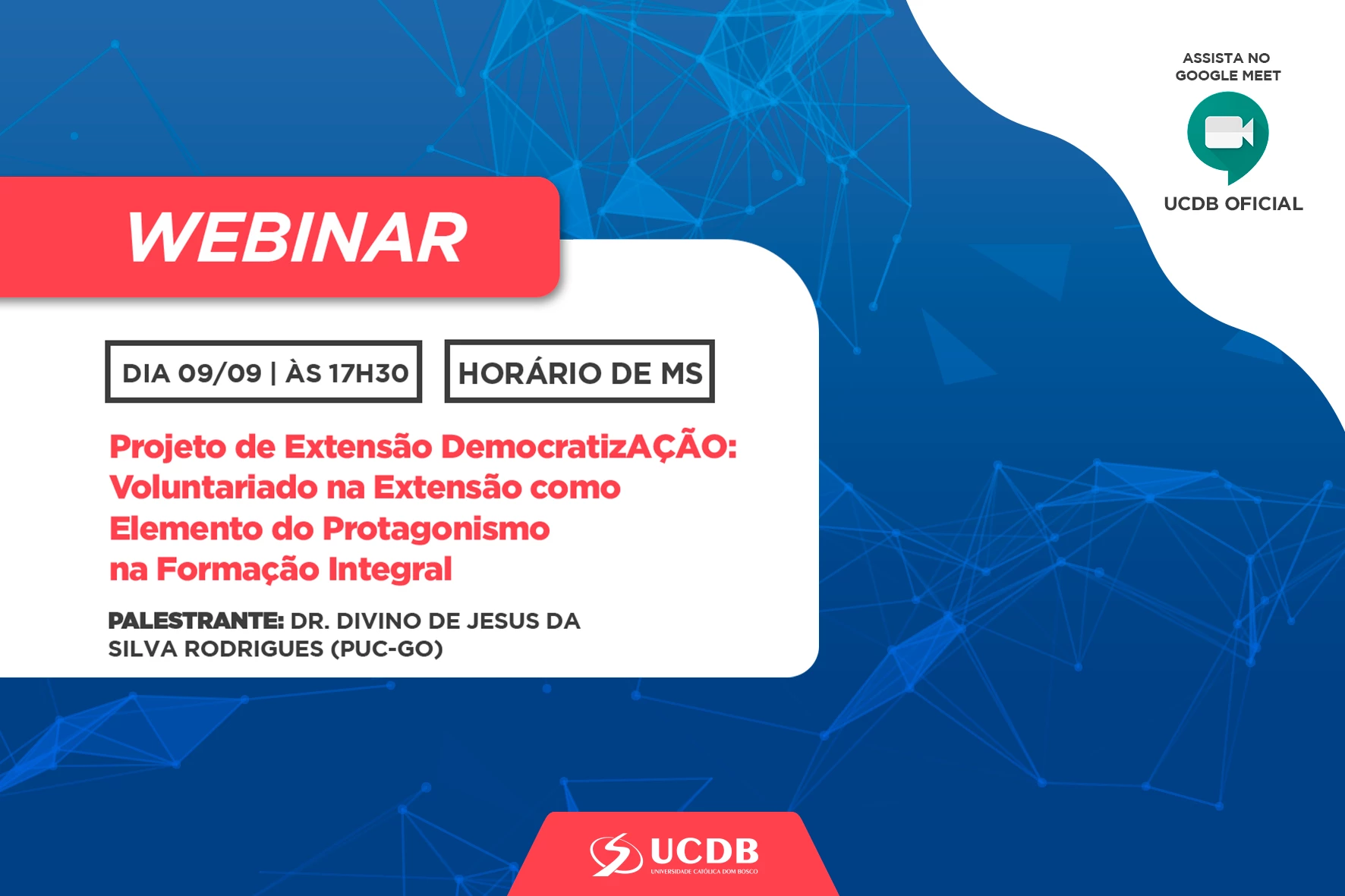 Professor da Pontifícia Universidade Católica de Goiás, Dr. Divino de Jesus da Silva Rodrigues, ministra nesta quinta-feira (9), a partir das 17h30, por meio do Google Meet, palestra para falar sobre ‘Voluntariado na Extensão como Elemento do Protagonismo na Formação Integral’. O evento é destinado para acadêmicos, professores de projetos de extensão e público em geral.