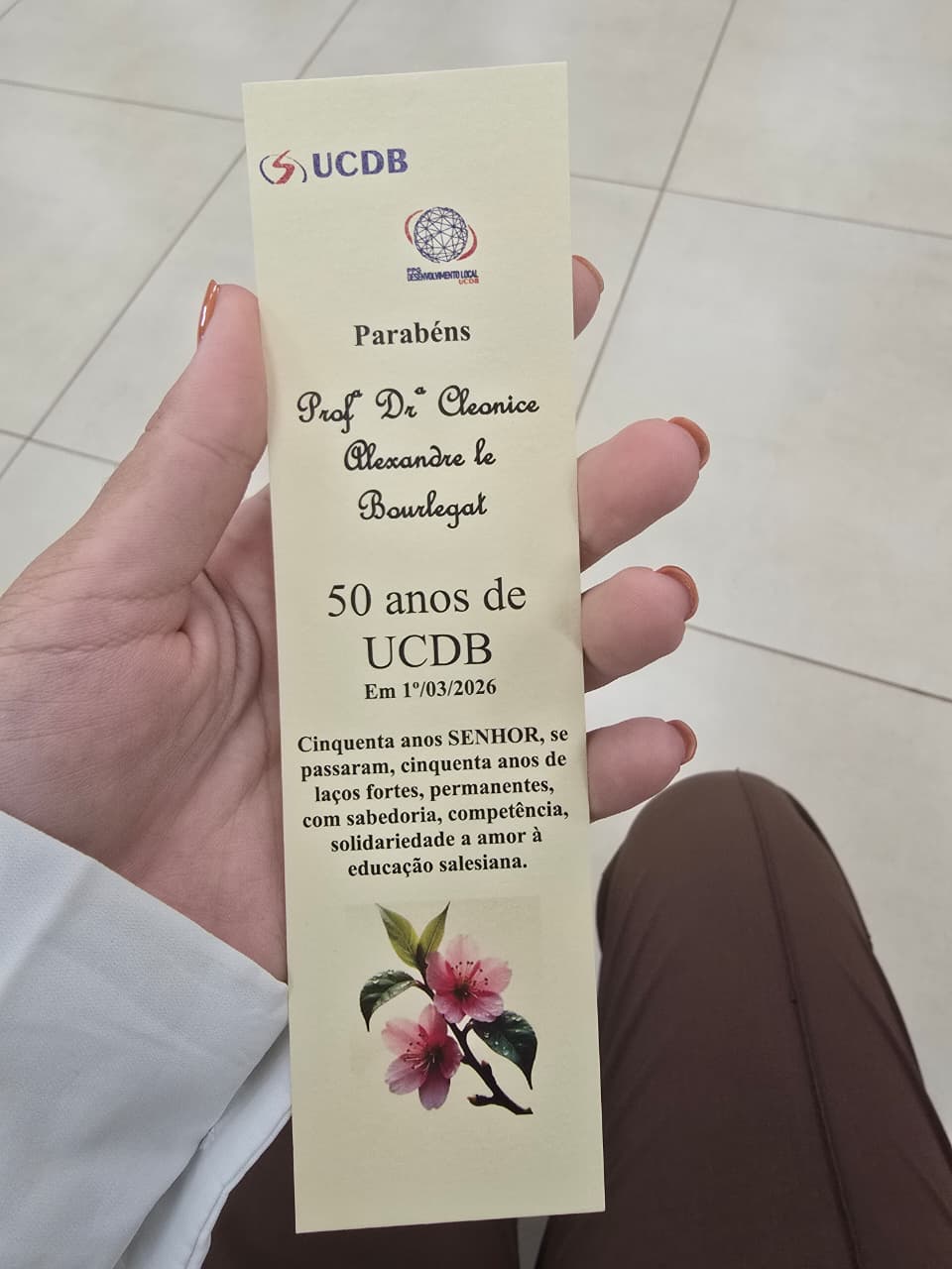 A docente do Programa de Pós-graduação em Desenvolvimento Local da Universidade Católica Dom Bosco (UCDB), professora Cleonice Le Bourlegat, completou 50 anos de atuação na instituição e foi homenageada pelos colegas nesta segunda-feira (2), com uma celebração surpresa no campus.