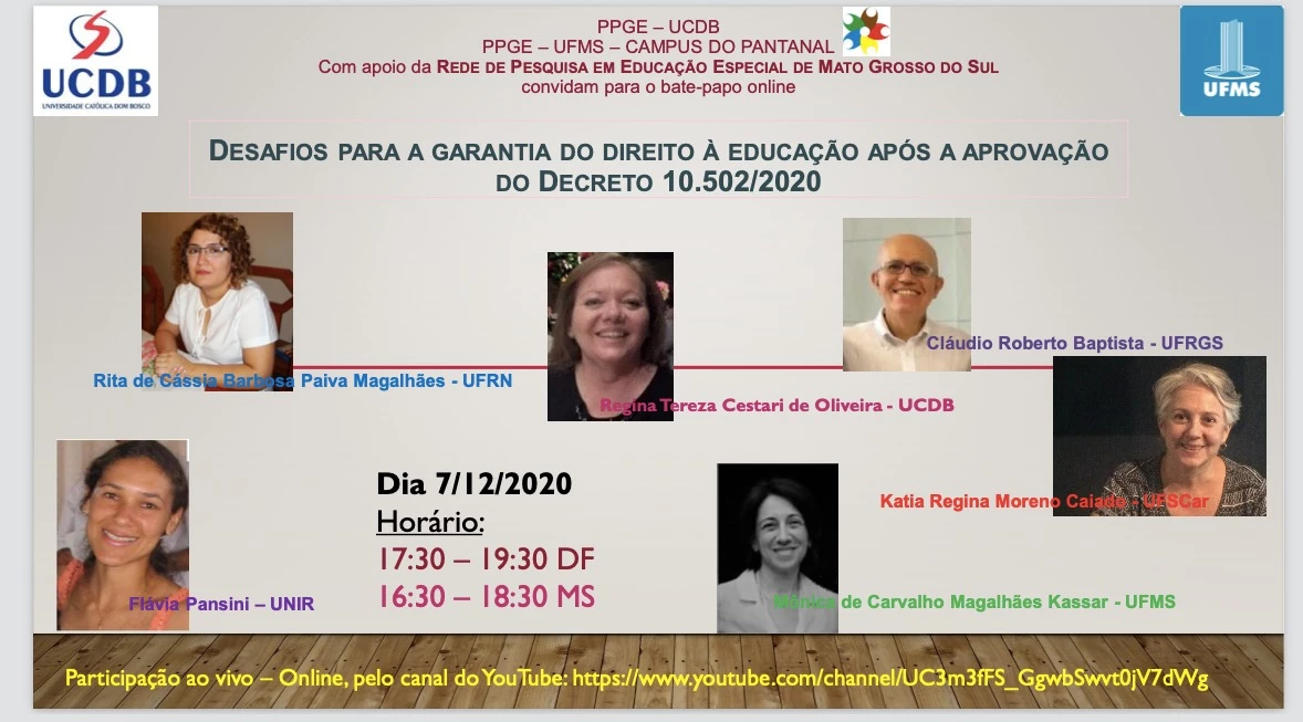 A professora Dra. Regina Tereza Cestari de Oliveira, do Programa de Pós-graduação mestrado e doutorado em Educação da Universidade Católica Dom Bosco (UCDB) participa na segunda-feira (7), às16h30, da roda de conversa ‘Desafios para a garantia do direito à educação após a aprovação do Decreto 10.502/2020’. O evento, que é uma parceria da UCDB e a Universidade Federal de Mato Grosso do Sul (UFMS), com apoio da Rede de Pesquisa em educação especial de Mato Grosso do Sul, terá transmissão on-line pela internet.