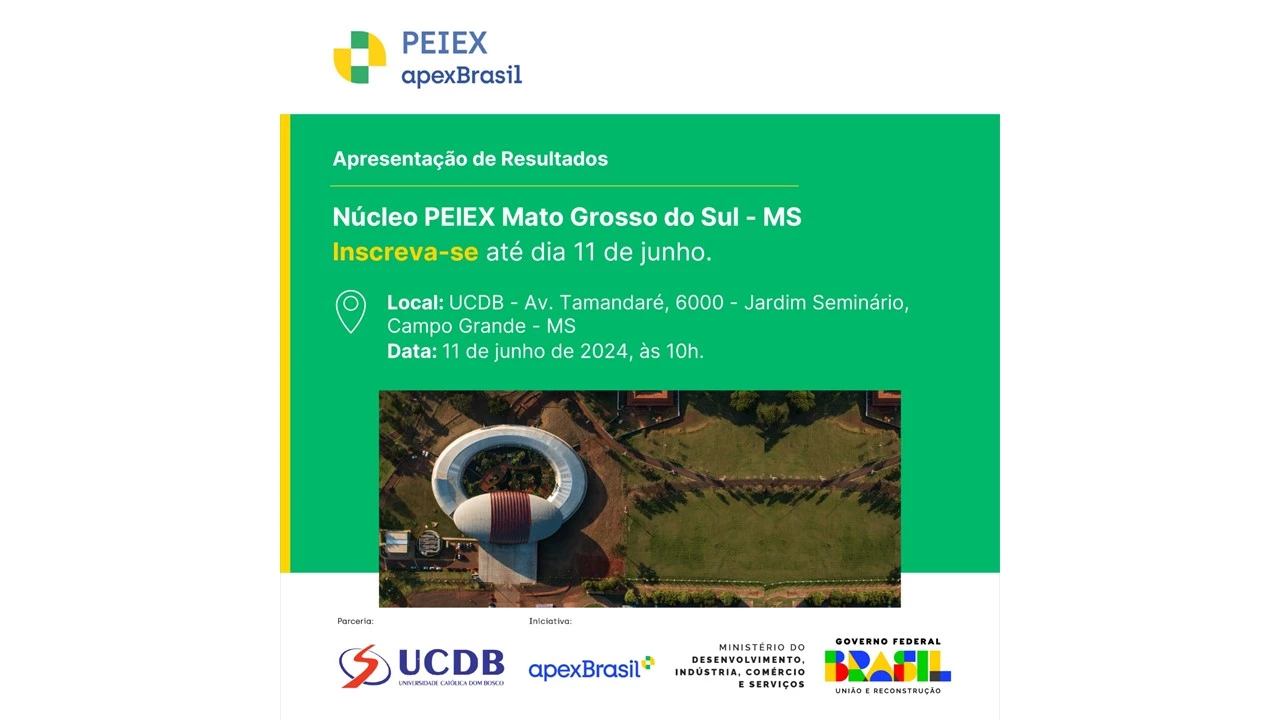 O Programa de Qualificação para Exportação (Peiex), em Mato Grosso do Sul, uma parceria da Agência Brasileira de Promoção de Exportações e Investimentos (ApexBrasil) e a Universidade Católica Dom Bosco (UCDB), por meio da Agência de Inovação e Empreendedorismo (S-Inova), vão apresentar os resultados do ciclo 2022-2024 na próxima terça-feira (11), às 10 horas, na sala 41 no bloco D da Católica. O evento contará com a presença de diversas autoridades do setor.
