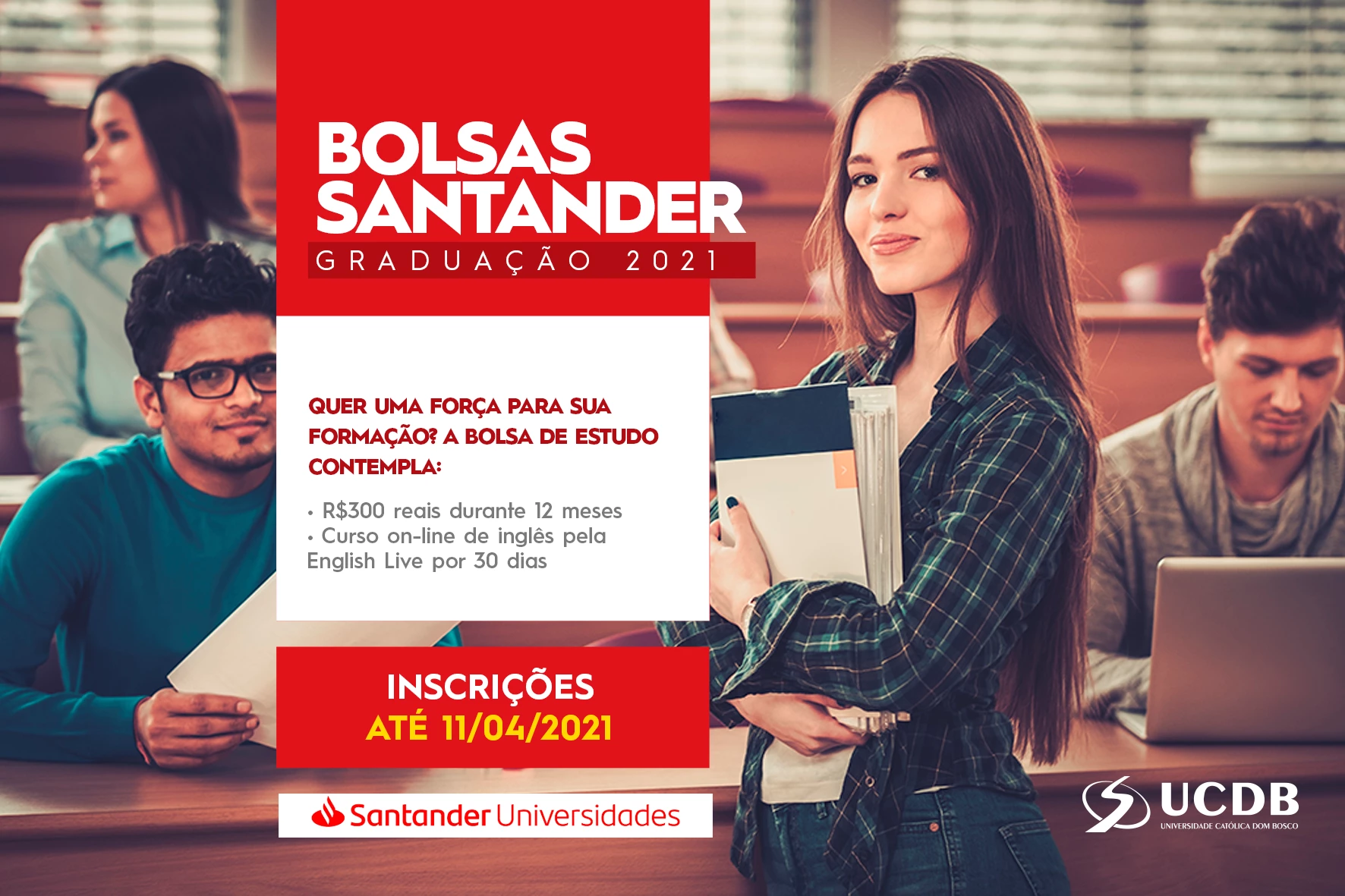 Estão abertas as inscrições para o processo de seleção do Programa de Bolsas do Santander Universidades que vai conceder 12 bolsas-auxílio no valor total de R$ 3,6 mil por ano para acadêmicos de graduação ou pós-graduação (presencial ou a distância) em condição de vulnerabilidade social da Universidade Católica Dom Bosco (UCDB), para que tenham a oportunidade de dar continuidade aos estudos, incrementando a qualidade da formação acadêmica. O período de inscrição termina no domingo (11).