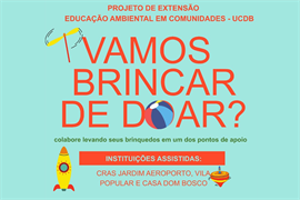 Dia 12 de outubro se aproxima e qual pequeno não gosta de ganhar brinquedos? Para tornar a data especial para mais de 500 crianças, professores e acadêmicos extensionistas do projeto Educação Ambiental em Comunidades iniciaram uma campanha de doação de brinquedos que beneficiará cidadãos atendidos nos Centros de Referência de Assistência Social (CRAS) do Jardim Aeroporto e da Vila Popular e da Casa Dom Bosco.