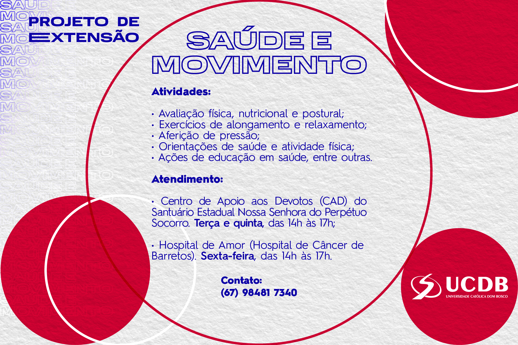 A Universidade CAtólica dom bosco (UCDB), por meio do projeto de extensão ‘Saúde em movimento’ leva diversas atividades à população durante três dias da semana em dois espaços de Campo Grande, no Centro de Apoio aos Devotos do Santuário Estadual Nossa Senhora do Perpétuo Socorro e no Hospital de Amor (Hospital do Câncer de Barretos). O projeto conta com acadêmicos da Católica dos cursos de Nutrição, Enfermagem, Fisioterapia e Educação Física.