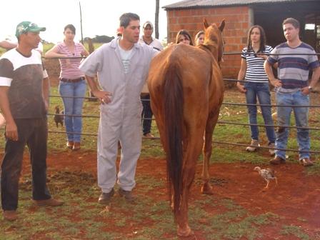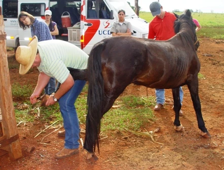 A primeira propriedade visitada, foi do Sr. Narciso Abero, 63, que mora no local a 11 anos com a esposa Neuza Ferreira, 57. A equipe realizou uma cirurgia de castração em um cavalo há uma semana e fizeram, desta vez, os curativos para retirar as impurezas que ficaram após a cirurgia. “Ele adorava pular a cerca, e já estava me dando problemas. Agora ainda está se recuperando mais o serviço com certeza vai render muito mais” comentou Narciso, sobre a dependência do animal.