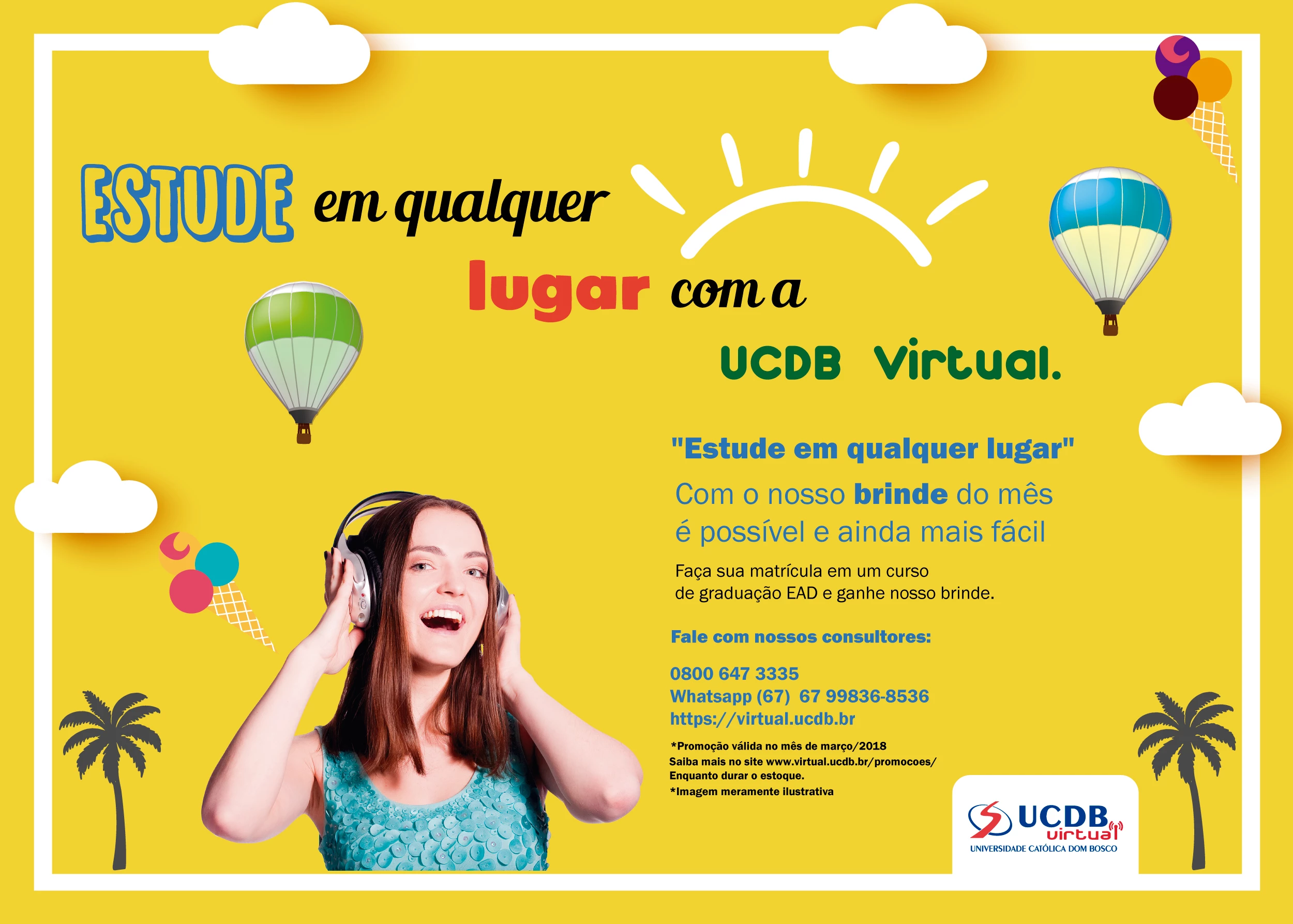 Neste mês de março, a UCDB Virtual está com promoção: os 100 primeiros novos alunos a efetuarem a matrícula entre os dias 12 a 31 de março em um curso de graduação a distância (EAD), ganharão um headphone Master Dobrável como brinde.