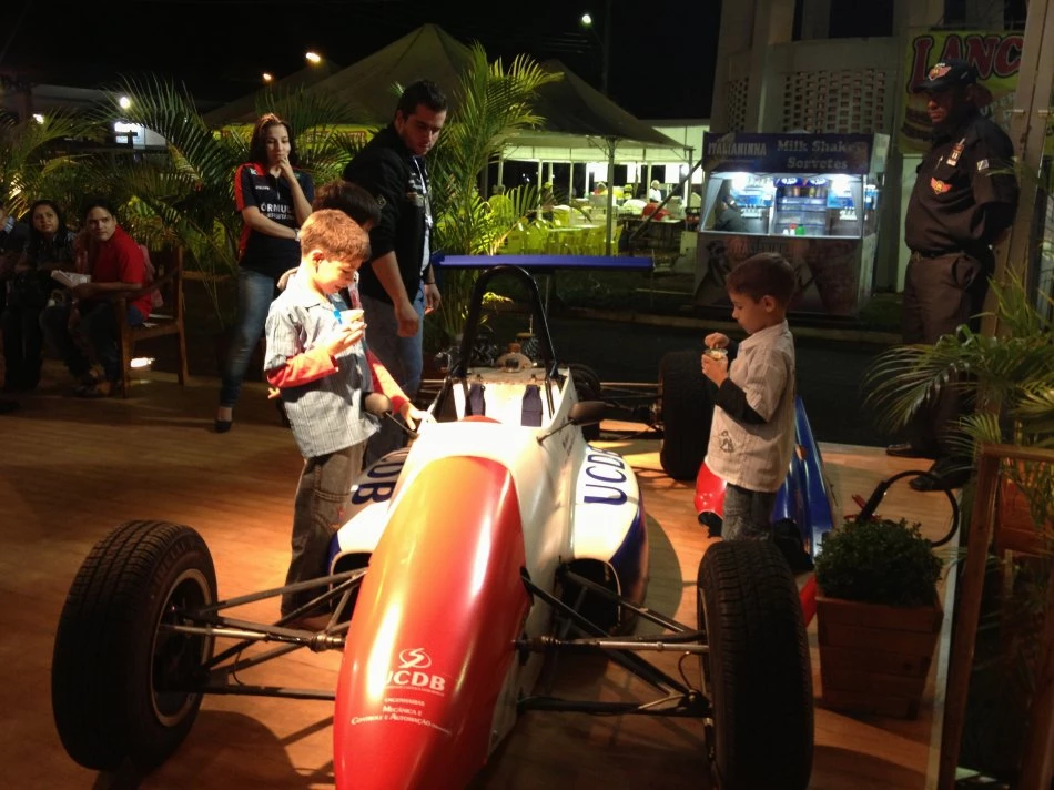Estacionado no stand da Universidade Católica Dom Bosco (UCDB), o carro da Fórmula Universitária, desenvolvido pelos acadêmicos de Engenharia de Automoção e Controle (Mecatrônica) e Engenharia Mecânica, é destaque na maior feira agropecuária do Centro-Oeste, a Expogrande. No local há membros da equipe da Católica que explicam o funcionamento do automóvel, para maior entendimento do público.
