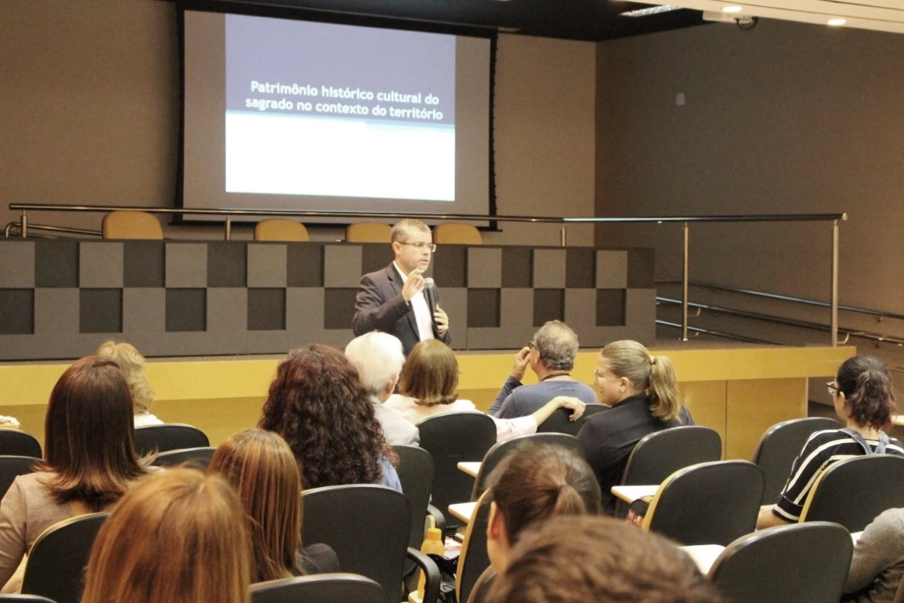 Pe. Ricardo Carlos, Reitor da Universidade Católica Dom Bosco (UCDB), ministrou na noite desta quinta-feira (26), uma palestra sobre o “Patrimônio histórico cultural do sagrado no contexto histórico”. Voltado para os acadêmicos do curso de História, discentes do Programa de Pós-Graduação Stricto Sensu em Desenvolvimento Local (PPDL) e para participantes do grupo de pesquisa “Cultura, religiosidade e saberes locais” da Instituição, o evento foi realizado no bloco M do campus Tamandaré.