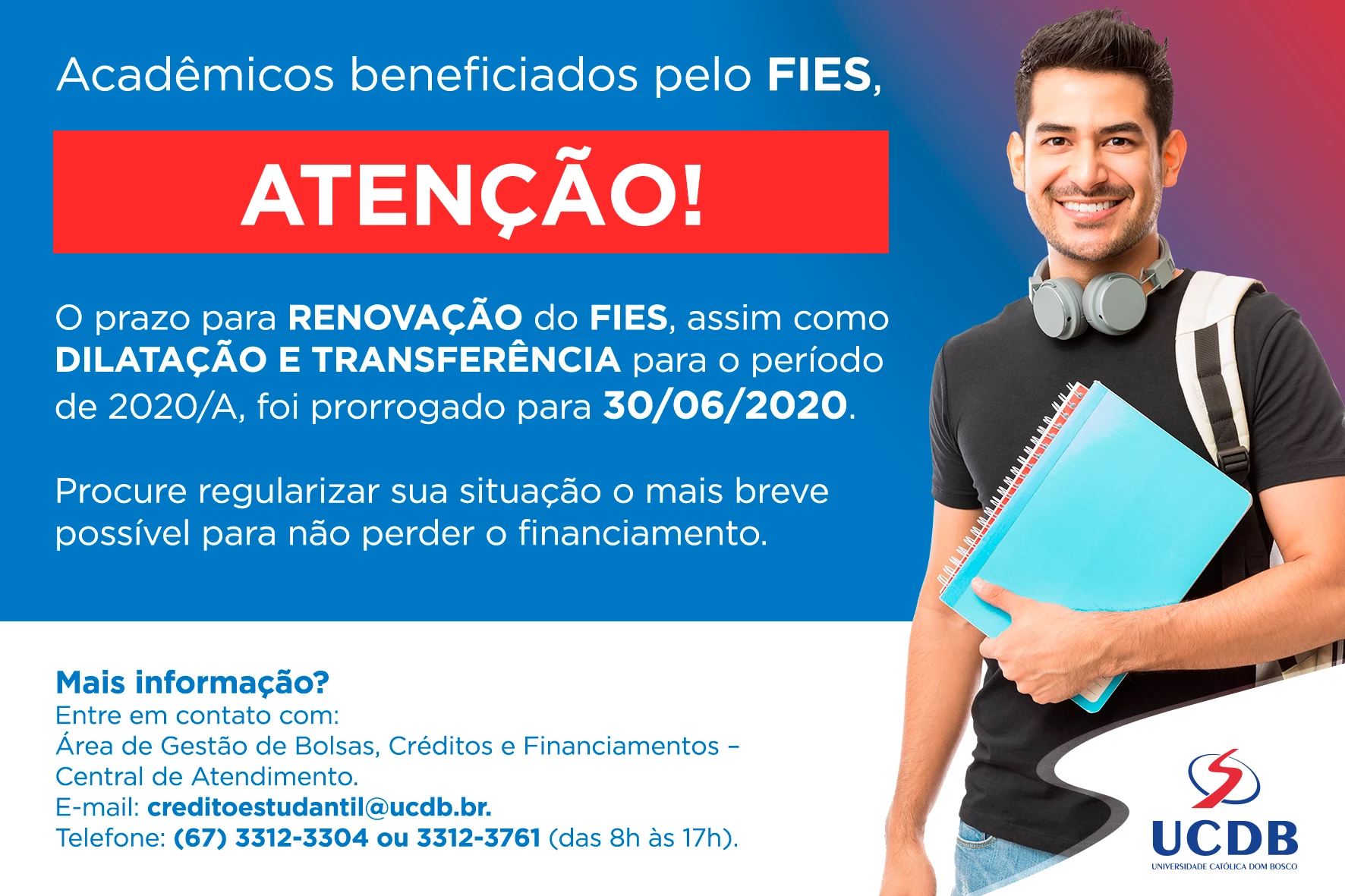 O prazo dos acadêmicos para a renovação do Fundo de Financiamento ao Estudante do Ensino Superior (Fies) do Ministério da Educação (MEC), assim como dilatação e transferência para o período 2020/A, foi prorrogado até o dia 30 de junho. Acadêmicos beneficiados com o Fies na Universidade Católica Dom Bosco (UCDB), em contratos aderidos até 2017, devem acessar o site http://sisfiesaluno.mec.gov.br/seguranca/principal, realizar o procedimento e imprimir o comprovante de validação de aditamento e os demais, a partir de 2018 o site de acesso é http://sifesweb.caixa.gov.br.