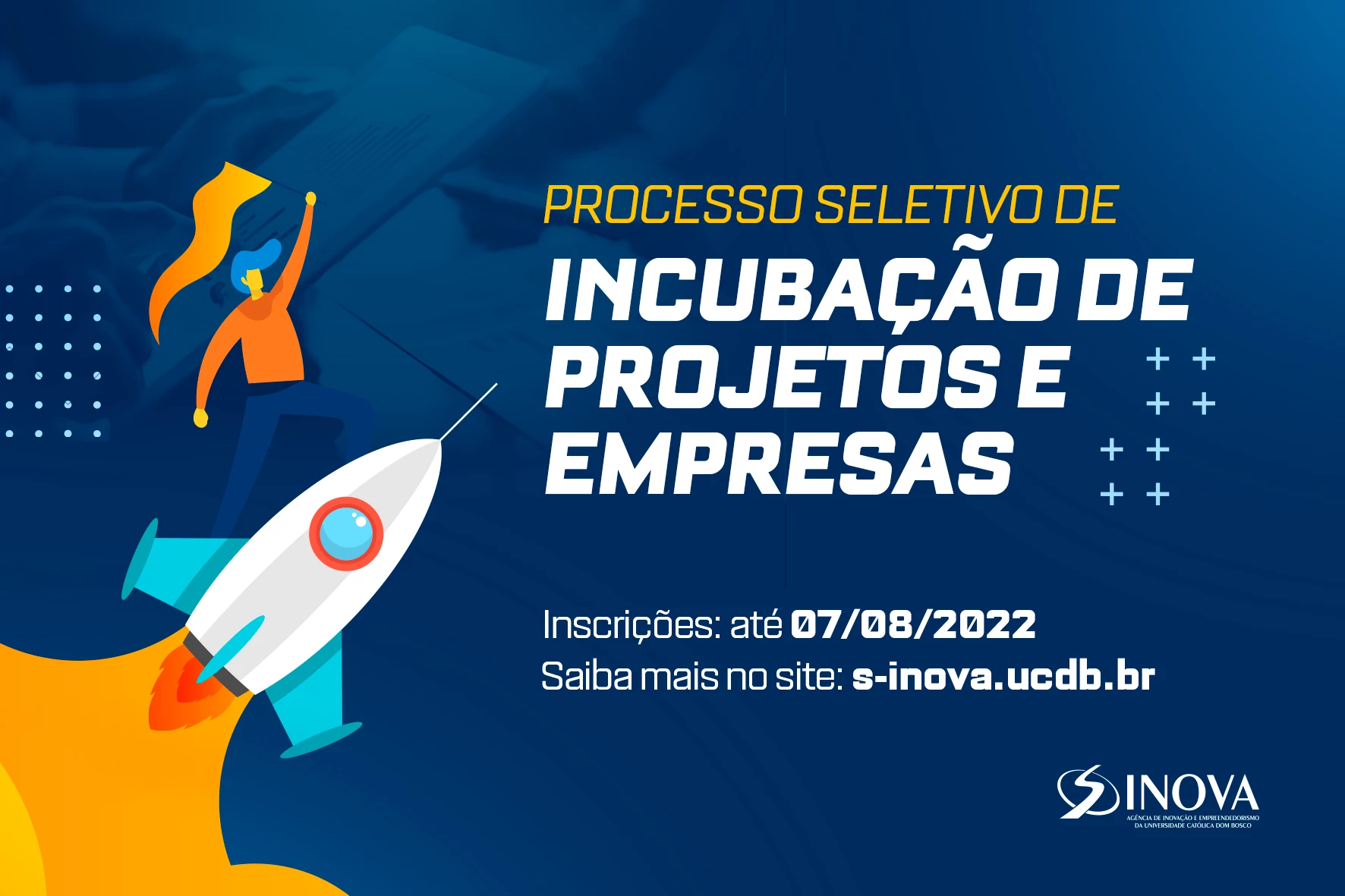 A Agência de Inovação e Empreendedorismo (S-Inova) da Universidade Católica Dom Bosco (UCDB) está com inscrições abertas para novos empreendedores que queiram participar do processo seletivo para o programa de incubação de projetos e empresas, que oferece apoio no desenvolvimento de negócios. O prazo para adesão é até 7 de agosto de 2022 e pode ser feito pelo site www.s-inova.ucdb.br.