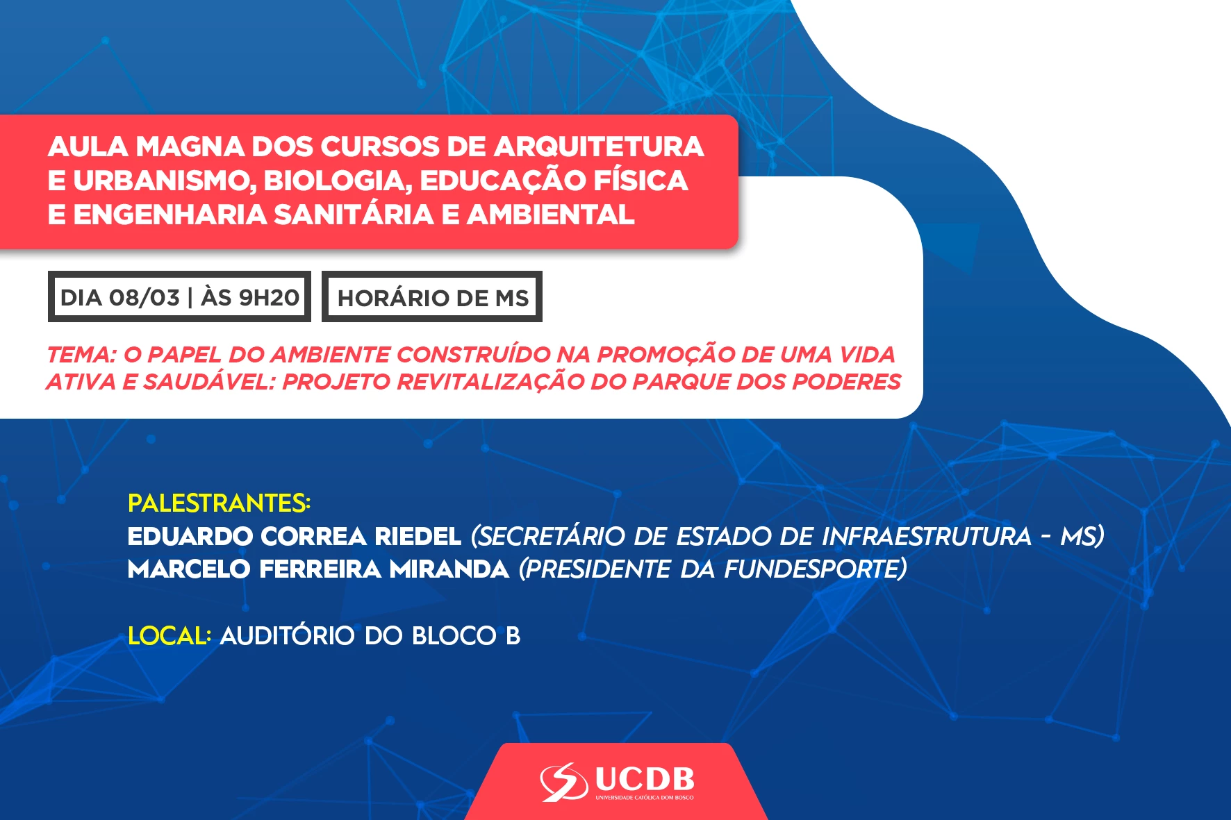 Aula magna dos cursos de Educação Física, Arquitetura e Urbanismo, Engenharia Sanitária e Ambiental e Ciências Biológicas será nesta terça-feira (8), a partir das 9h20, no auditório do bloco B. O tema será “O papel do ambiente construído na promoção de uma vida ativa e saudável: Projeto amigos do parque e revitalização do Parque dos Poderes” e será abordado pelo secretário de Estado de Infraestrutura Eduardo Riedel e pelo presidente da Fundação Estual de Esporte (Fundesporte), Marcelo Miranda.