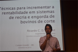 Em seguida, o engenheiro agrônomo Dr. Ricardo Cazerta Duarte Goulart abordou técnicas para incrementar a rentabilidade em sistemas de recria e engorde de bovinos de corte. “O setor está em alta, assim como a demanda por pesquisas nessa área. Quero mostrar que existe técnica e que é preciso estudar muito, estar sempre atualizado”.