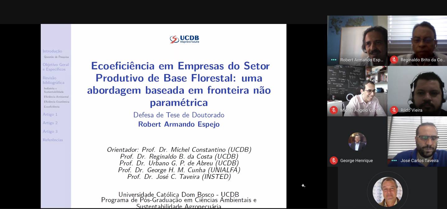 O Programa de Pós-Graduação Stricto Sensu em Ciências Ambientais Sustentabilidade Agropecuária da Universidade Católica Dom Bosco (UCDB) realizou no dia 12 de fevereiro, por meio de videoconferência a defesa de tese do doutorando Robert Armando Espejo, com o tema “Ecoeficiência em Empresas do Setor Produtivo de Base Florestal: Uma Abordagem Baseada em Fronteira não Paramétrica”, sob a orientação do professor Dr. Michel Ângelo Constantino de Oliveira.