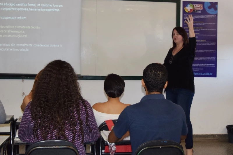Nesta quarta-feira (25), acadêmicos dos cursos de Biomedicina e Farmácia da Universidade Católica Dom Bosco (UCDB) participaram de uma palestra sobre toxicologia forense com a perita da Polícia Civil, Melissa Porto.