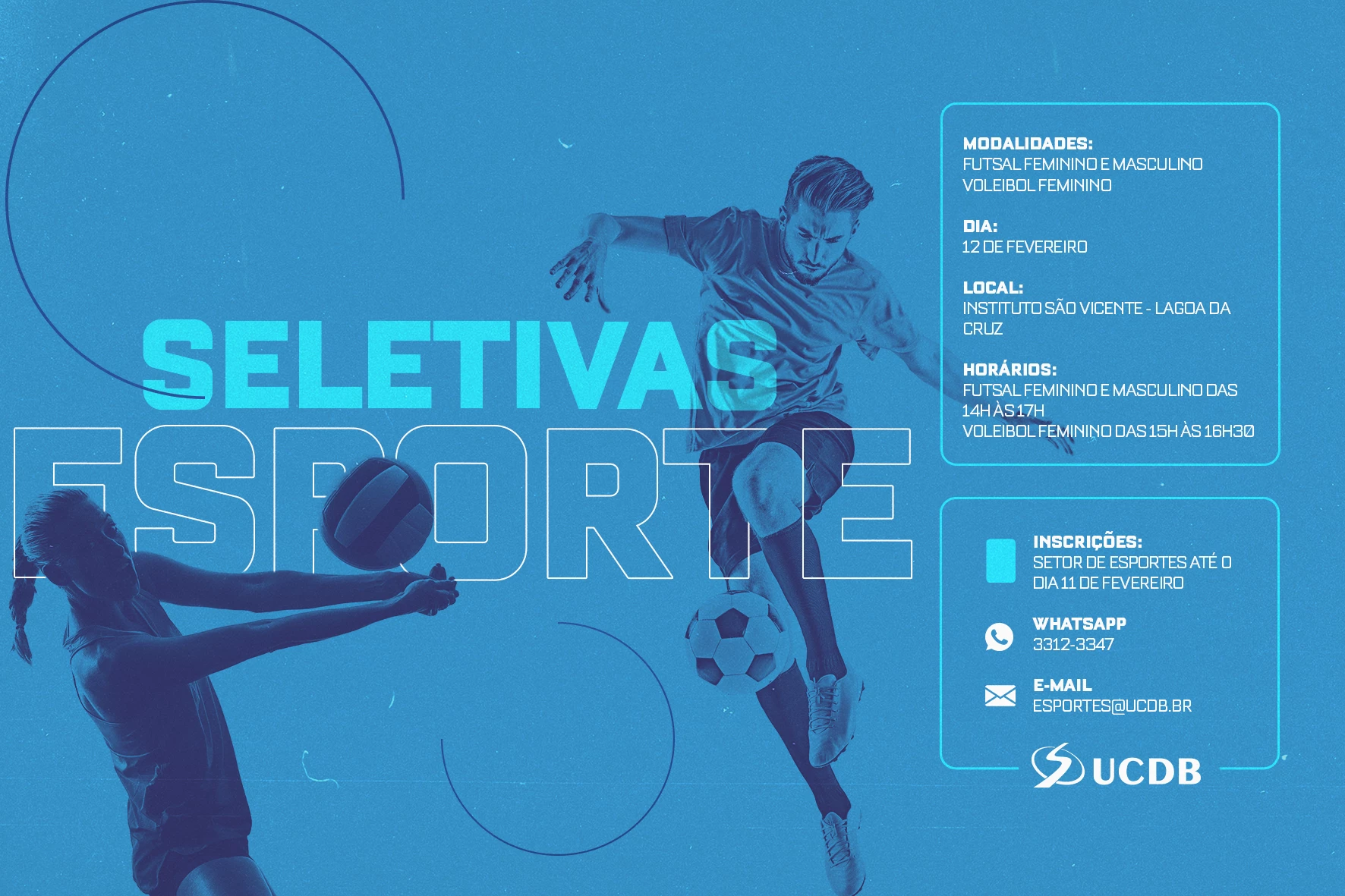 A Universidade Católica Dom Bosco (UCDB), por meio da área de Esportes, realiza no sábado (12) seletiva para novos atletas de futsal (masculino e feminino) e voleibol (feminino) para integrarem a equipe 2022. Os testes serão realizados no Instituto Salesiano São Vicente (Lagoa da Cruz), sendo das 14h às 17h para futsal e das 15h às 16h30 para o voleibol.