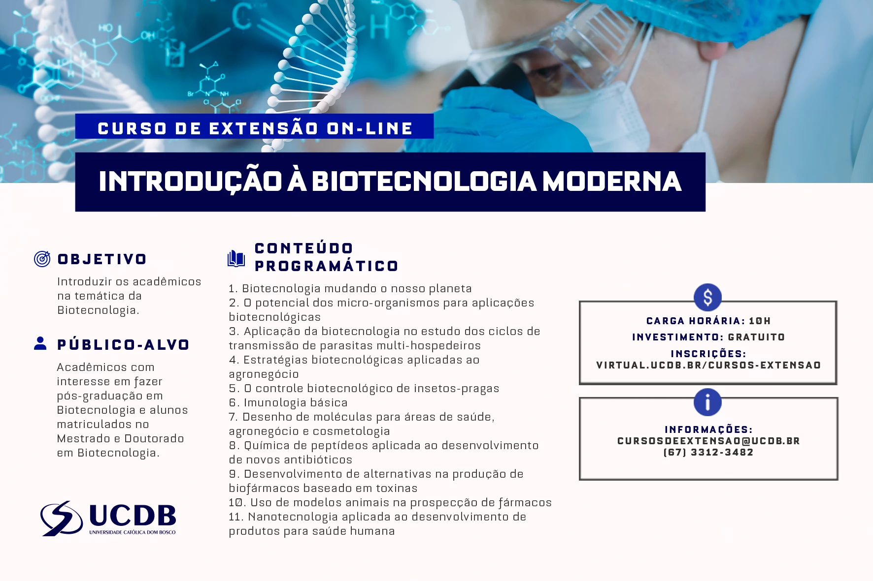 A produção de tecnologias que revolucionam a saúde, o bem-estar e a sociedade estão interligadas à biotecnologia — uma ciência que, a partir dos estudos com organismos vivos, cria novos processos e produtos em benefício da humanidade. Sabendo da abrangência do interesse de estudantes e profissionais nessa área, a Universidade Católica Dom Bosco lança o curso de extensão on-line Introdução à Biotecnologia Moderna.