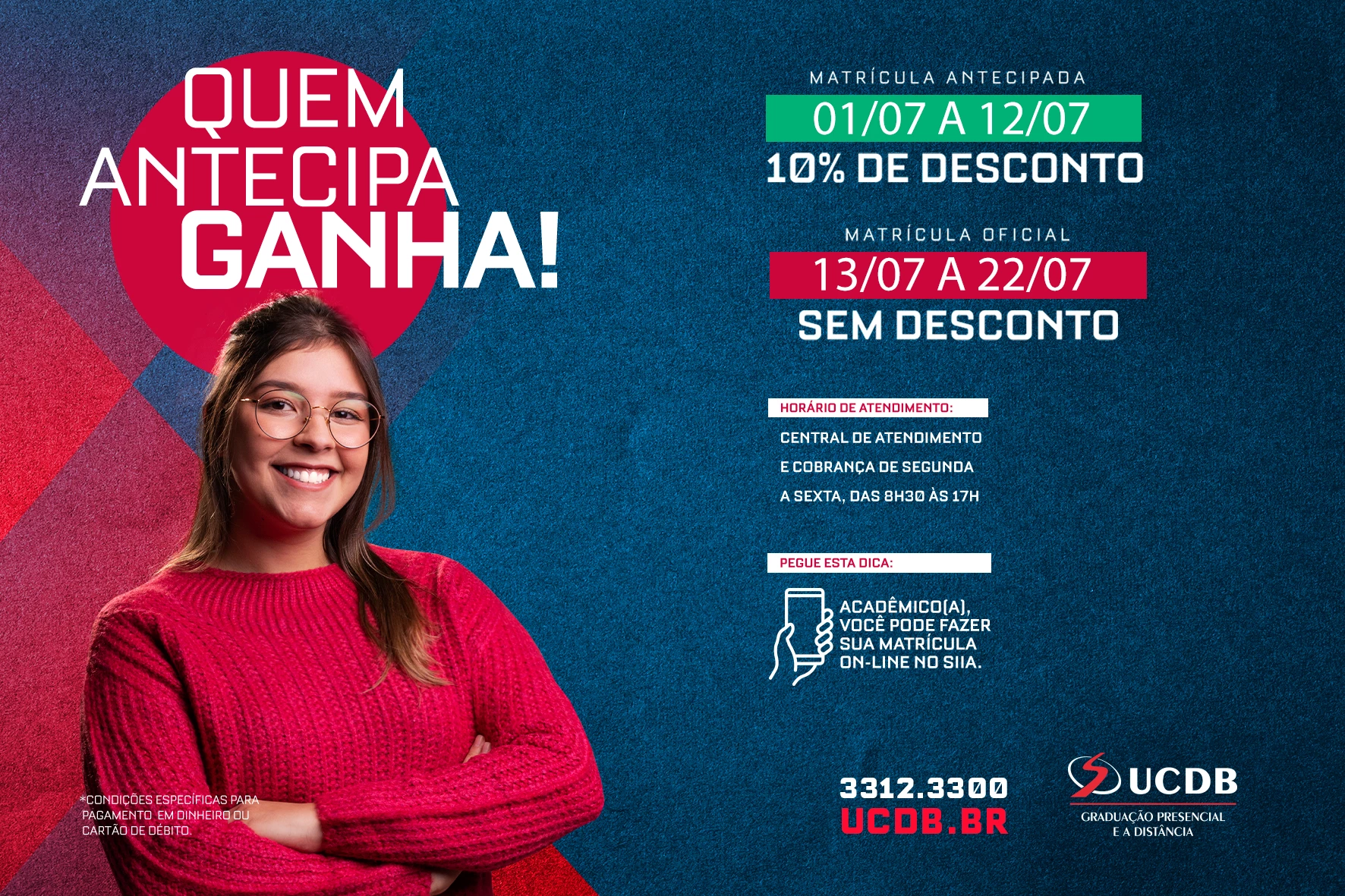A Universidade Católica Dom Bosco (UCDB) ampliou até a próxima segunda-feira (12) o prazo da matrícula antecipada 2021B para que acadêmicos veteranos garantam o desconto de 10%. O procedimento pode ser realizado diretamente pelo Sistema Integrado de Informações Acadêmicas (SIIA) ou na Central de Atendimento da UCDB, localizada no bloco Administrativo do campus Tamandaré, das 8h30 às 17h.