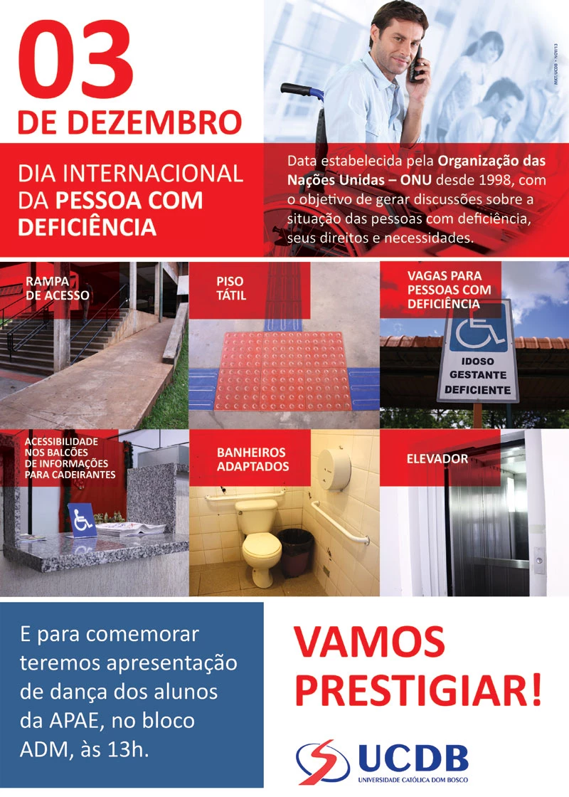 Hoje (3), a Universidade Católica Dom Bosco (UCDB) comemora o Dia Internacional da Pessoa com Deficiência com uma apresentação de dança dos alunos da Associação de Pais e Amigos dos Excepcionais (APAE). O evento será realizada no bloco Administrativo, a partir das 13h.