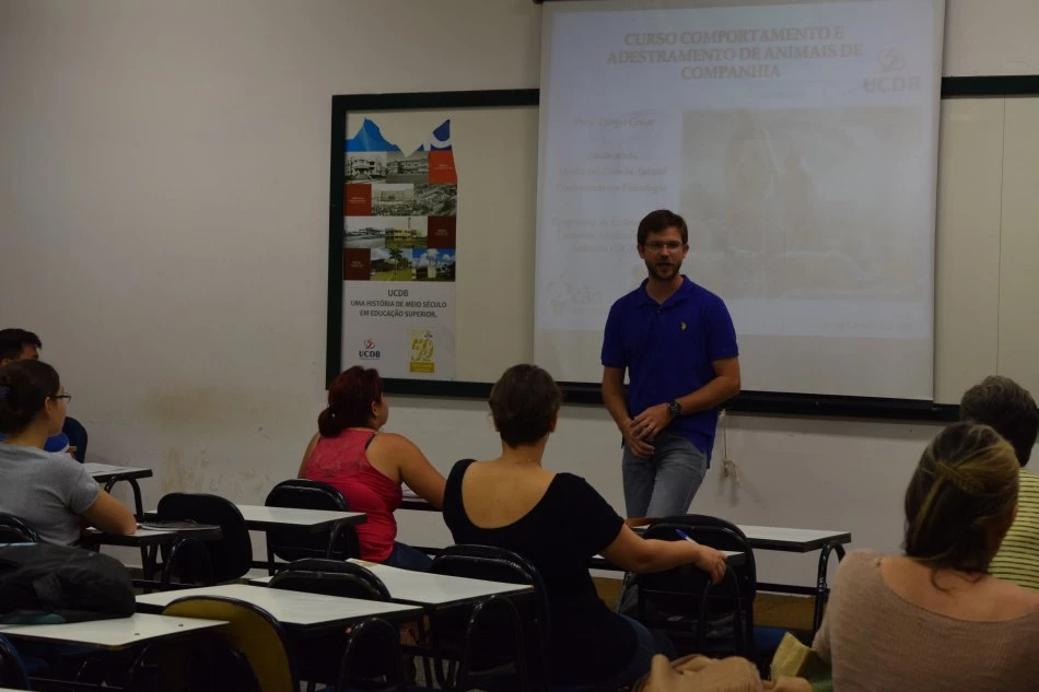 Teve início, na sexta-feira (6), a nova edição do curso de extensão “Comportamento e Adestramento de animais de companhia”, da Universidade Católica Dom Bosco (UCDB). O ministrante é o professor Diogo Cesár Gomes da Silva e participam das aulas profissionais e acadêmicos de Zootecnia, Medicina Veterinária, Biologia e criadores de cães e gatos. Durante a noite de abertura, o tema abordado foi “Conceitos atuais no comportamento animal”.