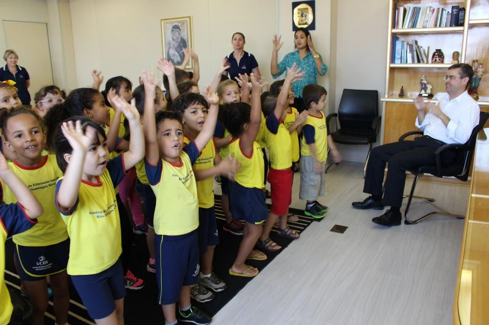 Ontem (10), as crianças foram até o gabinete da Reitoria e apresentaram uma música especialmente preparada para a data. Em retribuição, Pe. Ricardo brincou com os visitantes e apresentou números de mágica que surpreenderam os pequenos estudantes.