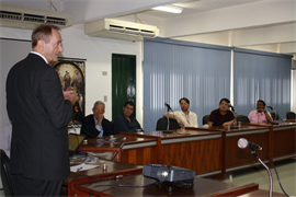 Durante a visita à UCDB, Michael Stopford participou de reunião com coordenadores dos Programas de Pós-graduação Stricto Sensu da UCDB e conheceu os trabalhos desenvolvidos no Biotério e no Museu das Culturas Dom Bosco.